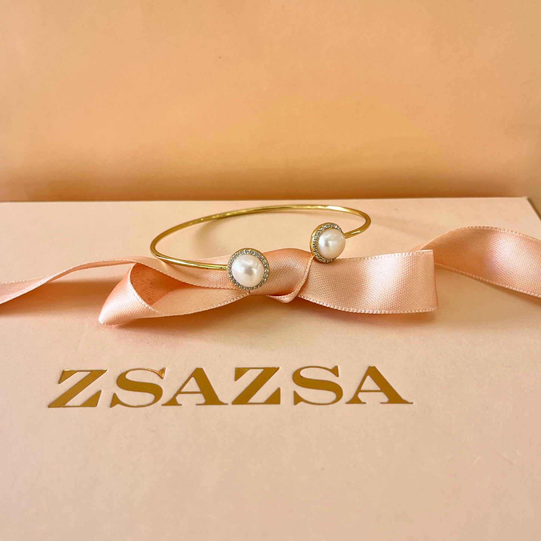 Zircone and fresh water pearls gold plated sterling silver bangle
