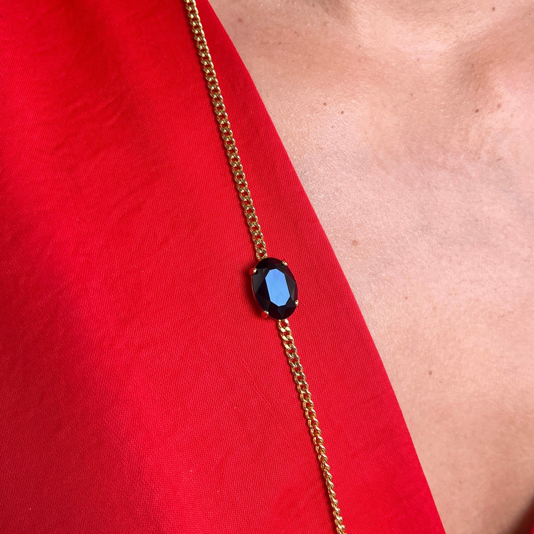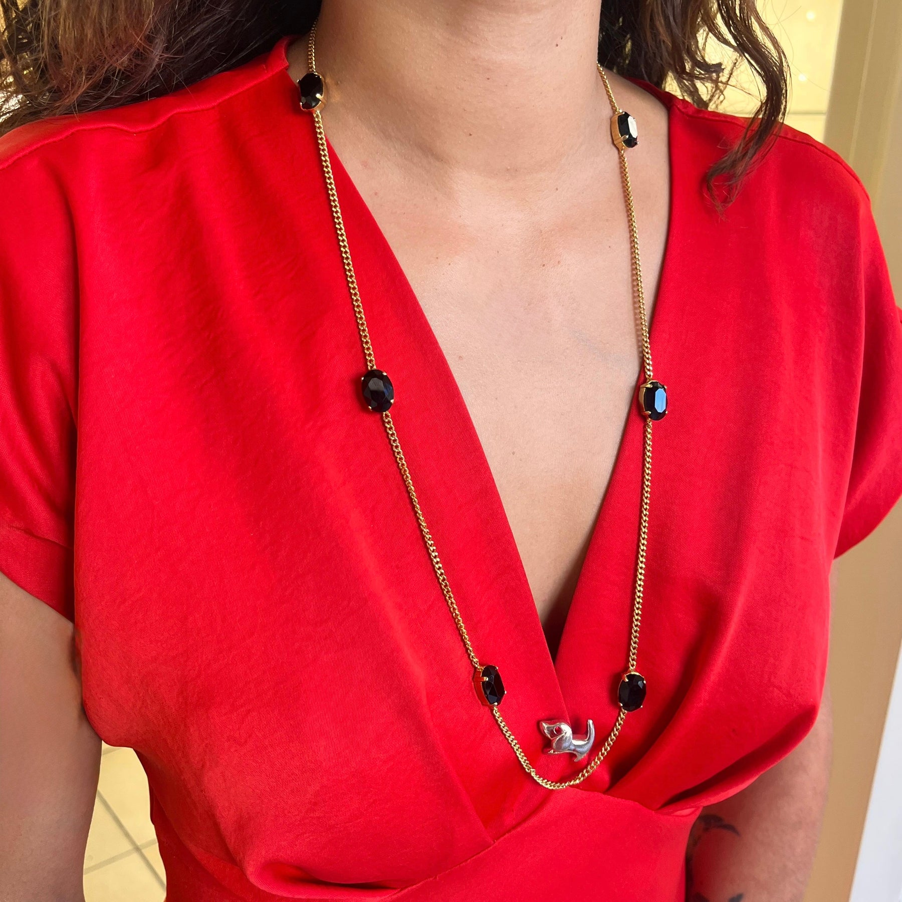 This long necklace features elegant black preciosa crystals, complemented by a gold plated chain. Perfect for any occasion, this necklace effortlessly adds a touch of sophistication to any outfit. A must-have for those who appreciate casual yet chic accessories.
