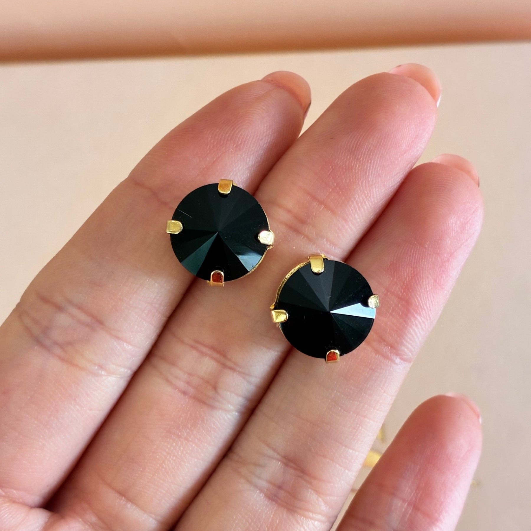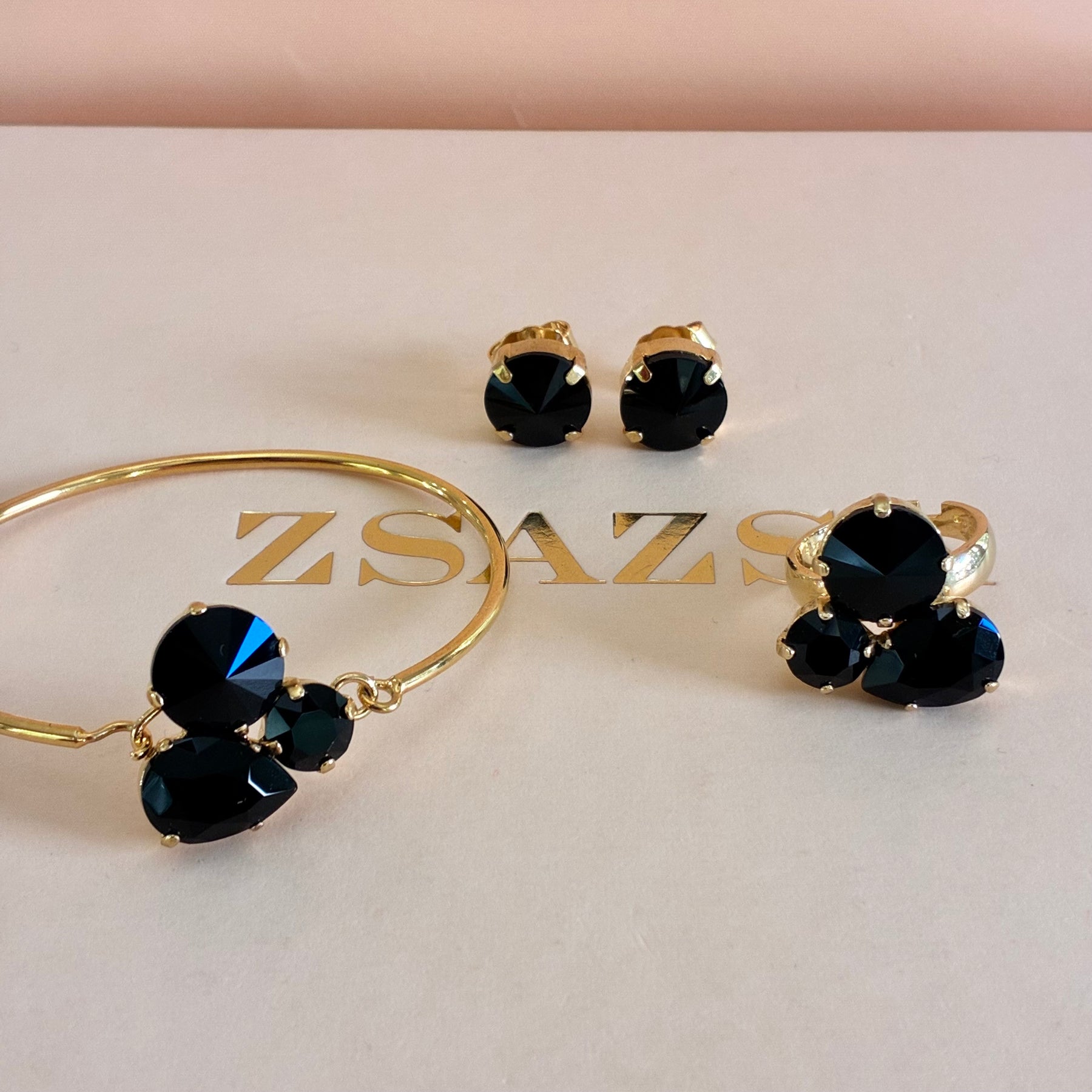 Introducing our elegant, versatile set featuring different shapes of black Swarovski crystals, all delicately gold plated. Perfect for any special occasion, this set will add a touch of glamour and sophistication to any outfit. Elevate your jewelry collection with this stunning and timeless piece.