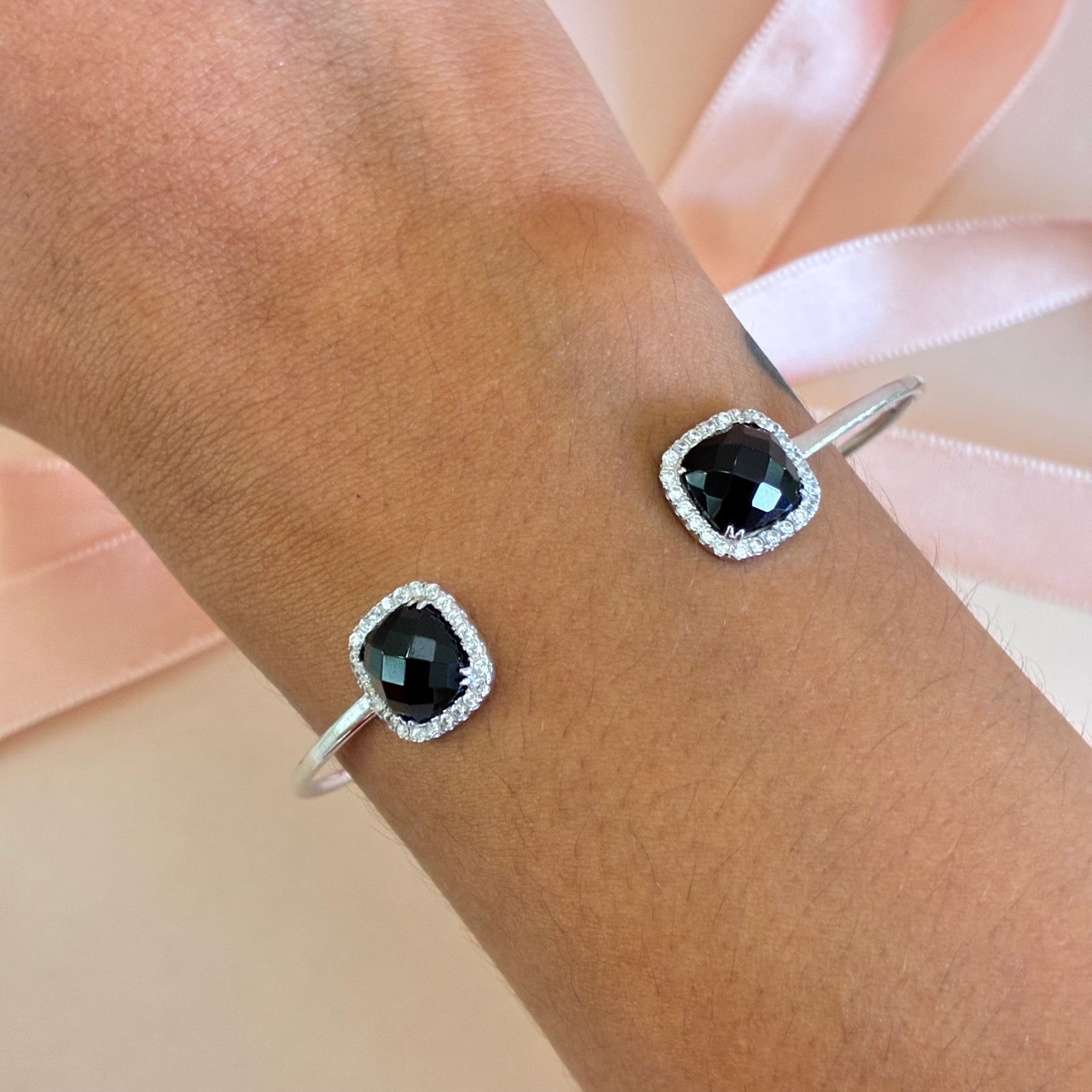 Expertly crafted with black zirconia, this refined bangle elevates any ensemble with its sleek design. The innovative open design offers effortless wear and modernizes a timeless piece. Enhance your fashion with this adaptable and chic bangle.