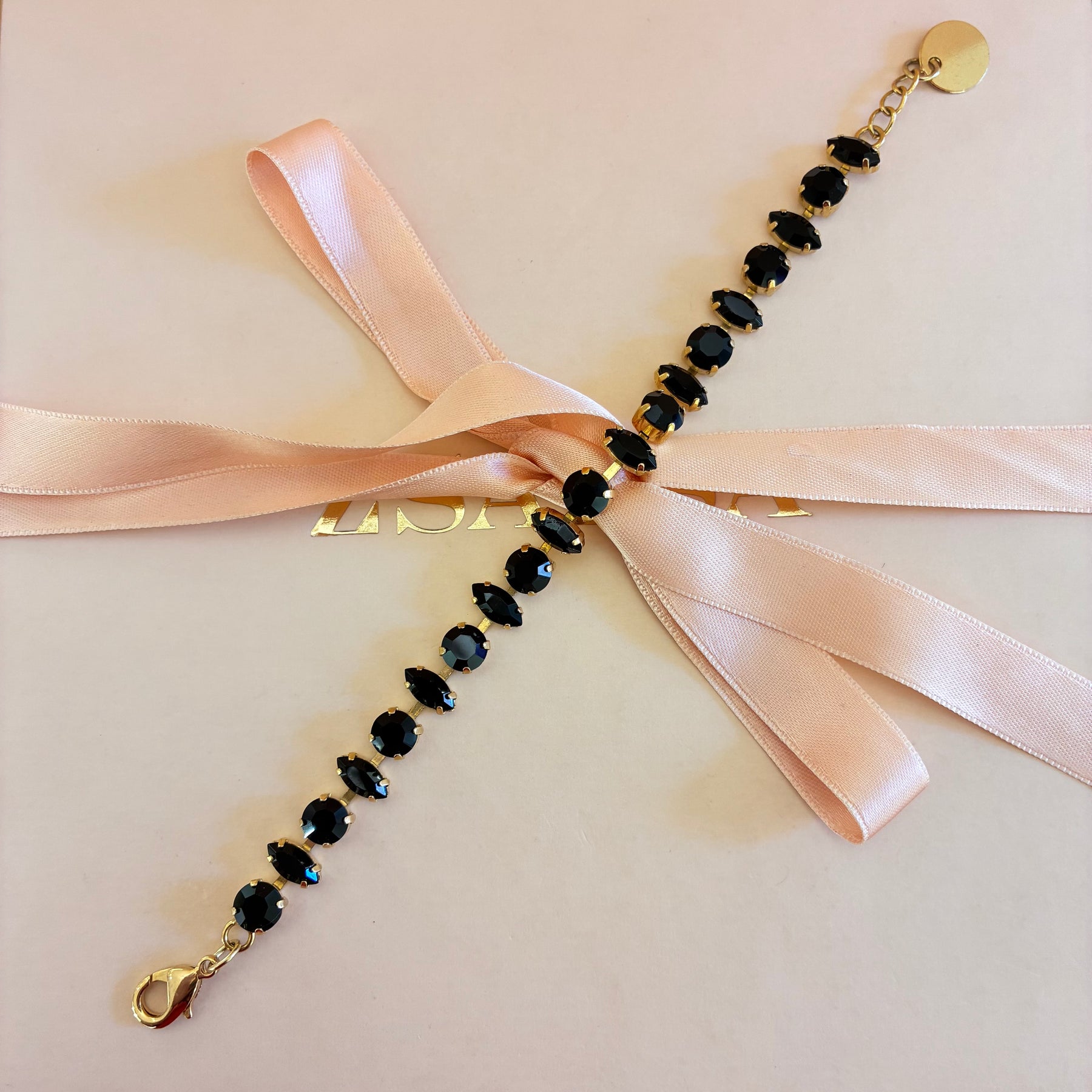 Enhance your sophisticated style with our Marquise and Round Black Preciosa Crystals Bracelet. The black preciosa crystals add a touch of elegance to any outfit. The unique marquise and round design, combined with the gold plating, create a stunning piece of jewelry that is sure to make a statement.