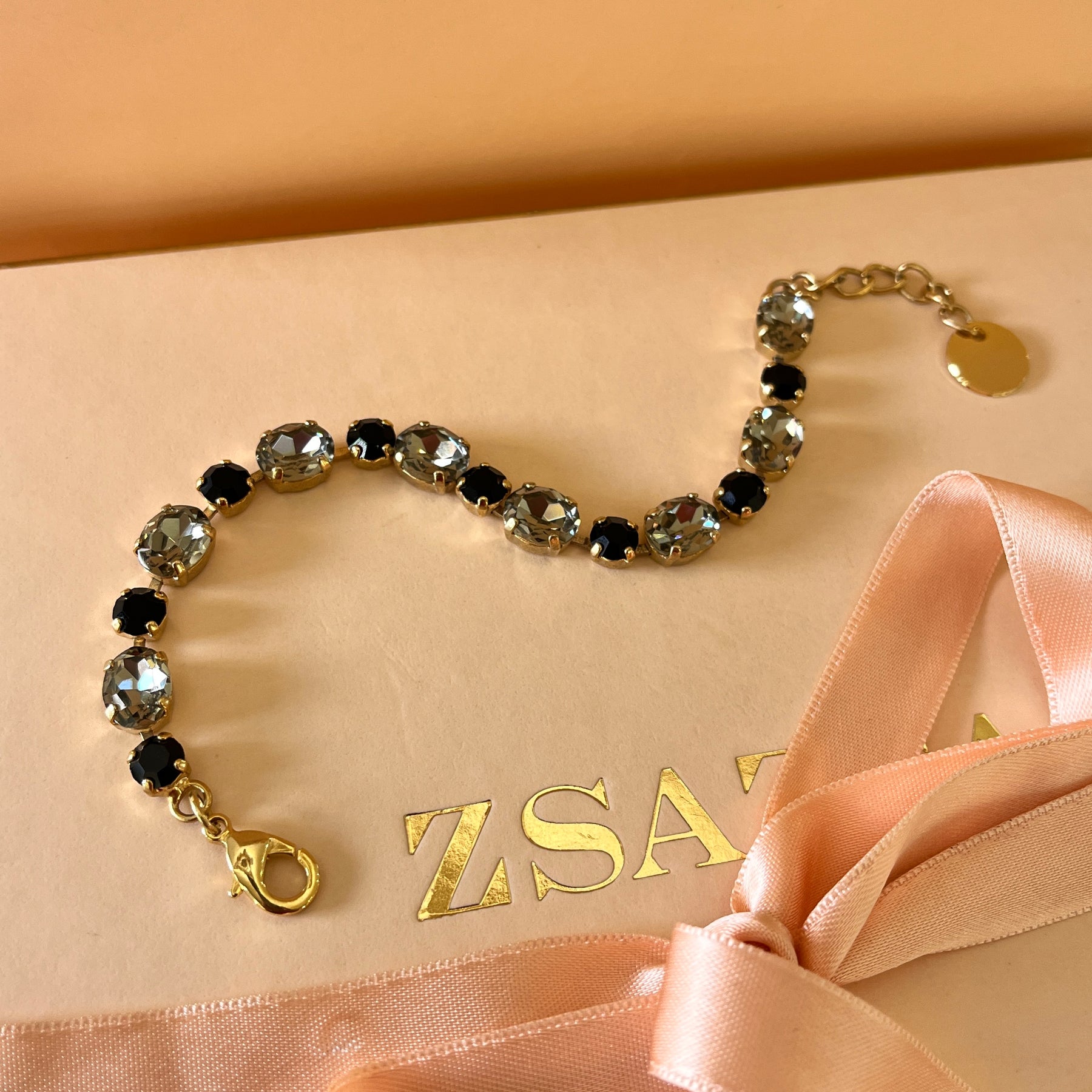 This gorgeous bracelet features a mix of grey and black preciosa crystals, known for their strong sparkle and elegance. With a variety of oval and round shapes, these crystals are carefully placed on a gold plated bracelet for a touch of glamour and sophistication. Elevate any outfit and make a statement with this stunning piece of jewelry!