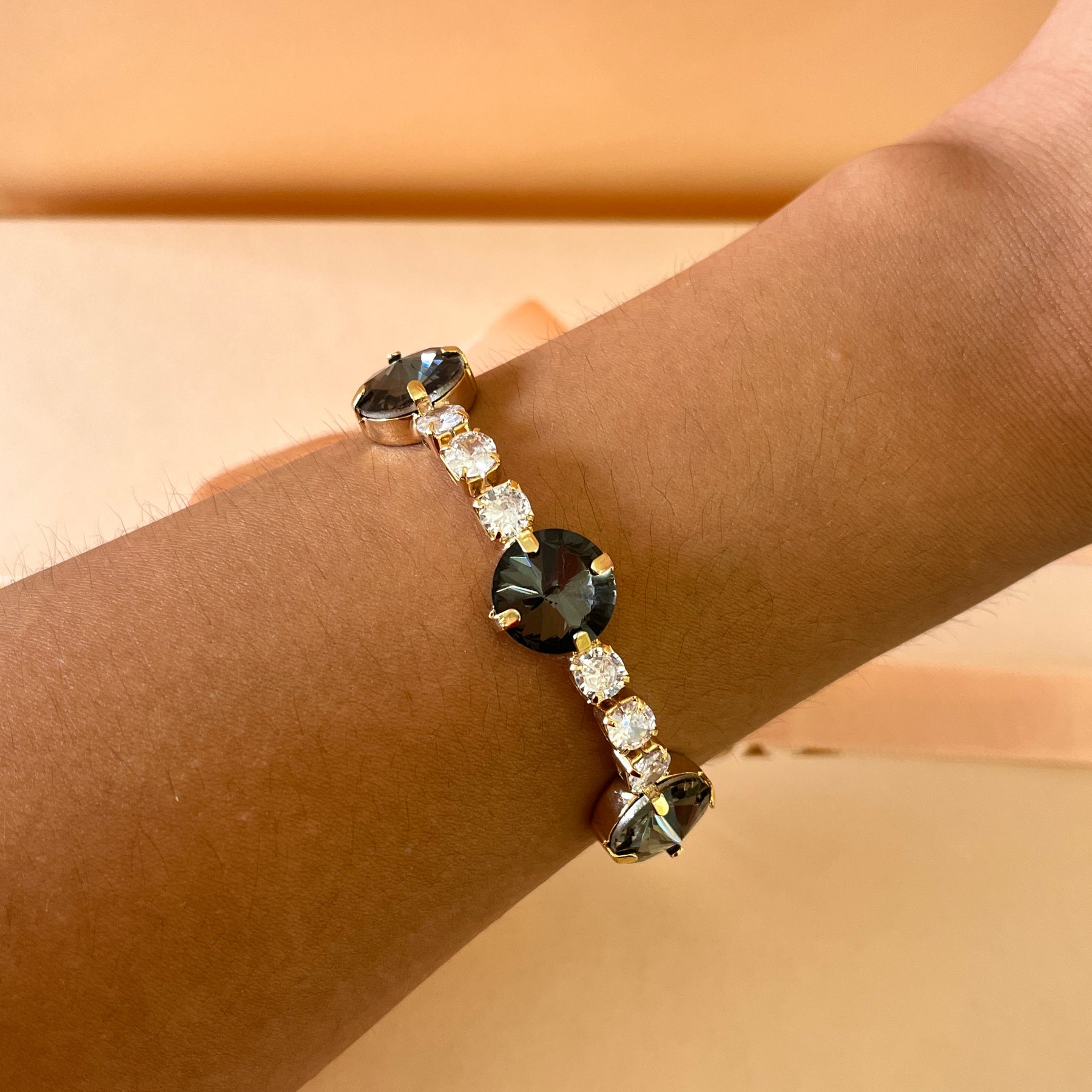 Add a touch of elegance to any outfit with the grey preciosa crystals bracelet. The gold plated design features three stunning crystals in the center, giving it a unique mix of sophistication and sportiness. Elevate your style with this beautifully tennis bracelet style piece.