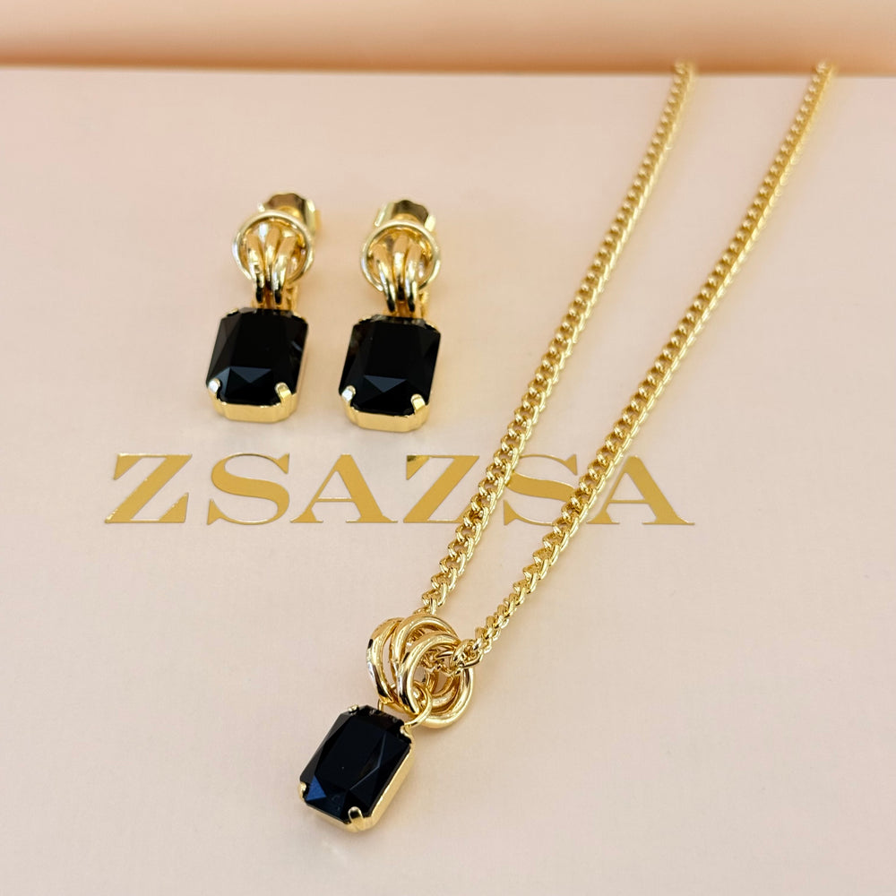 This stunning gold plated set features Black rectangular Swarovski crystals, adding a touch of sophistication to any outfit. The casual yet classic design makes it perfect for everyday wear, combining timeless elegance with a modern aesthetic. Elevate your style with the beautiful sparkle of Swarovski crystals.