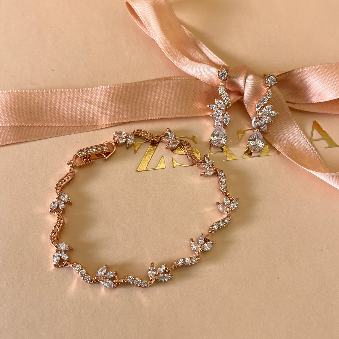 Teardrop and marquise zircone rose gold plated earrings and bracelet