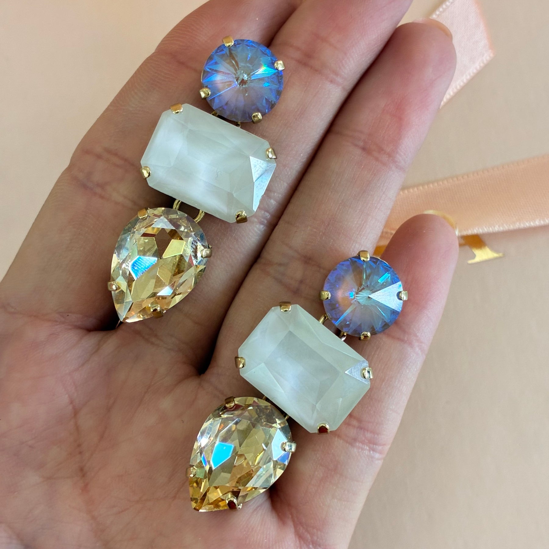 Add a touch of elegance to any outfit with these dangling earrings featuring champagne and purple Swarovski crystals. The gold-plated finish adds a luxurious touch, making them perfect for any occasion. Upgrade your style with this stunning and timeless accessory.
