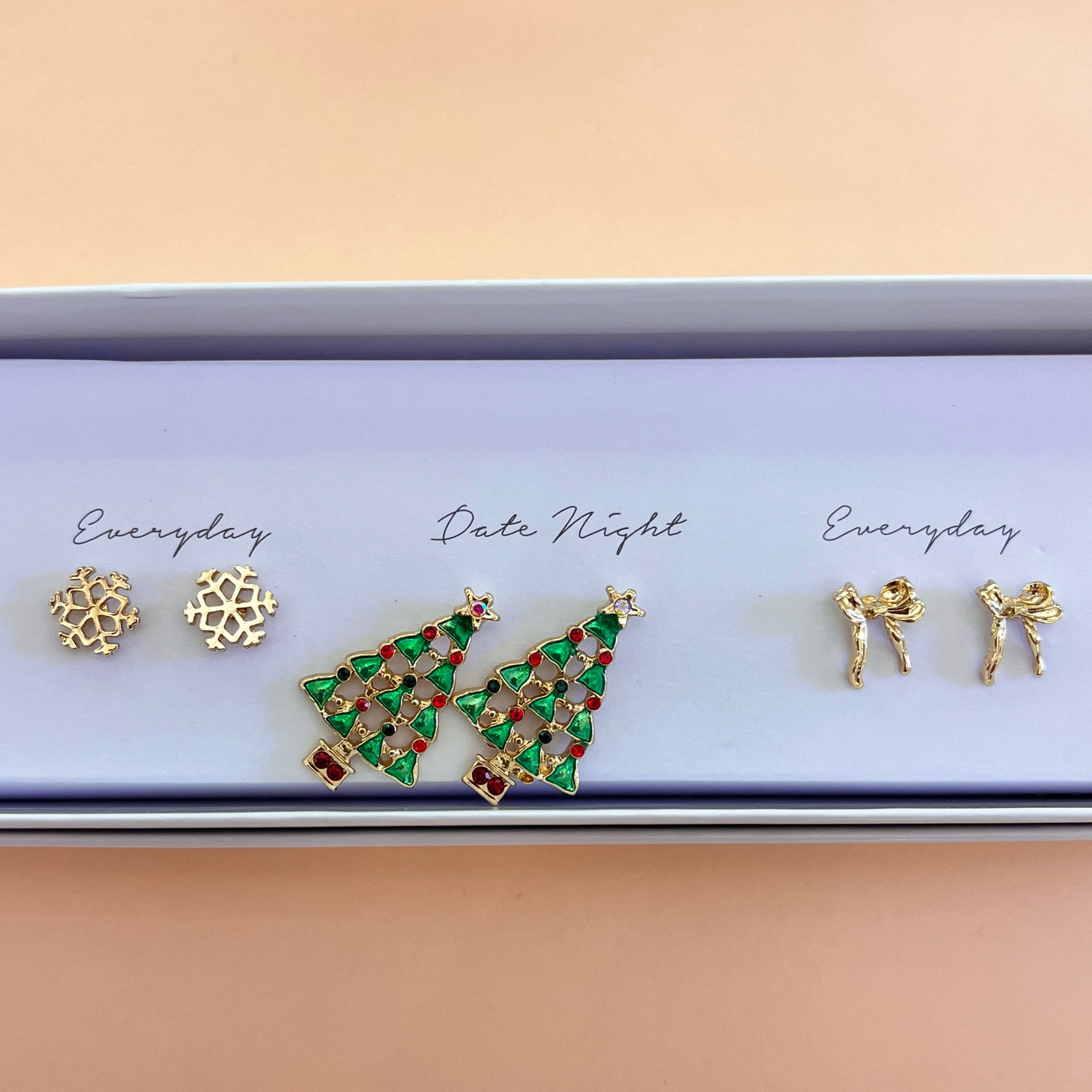 This box contains 5 pairs of charming gold-plated Christmas stud earrings, perfect for spreading holiday cheer. Thoughtfully designed as a sweet Christmas gift idea, these festive earrings add a touch of seasonal sparkle to any outfit. Ideal for sharing the joy of the season with loved ones or treating yourself to some holiday sparkle.