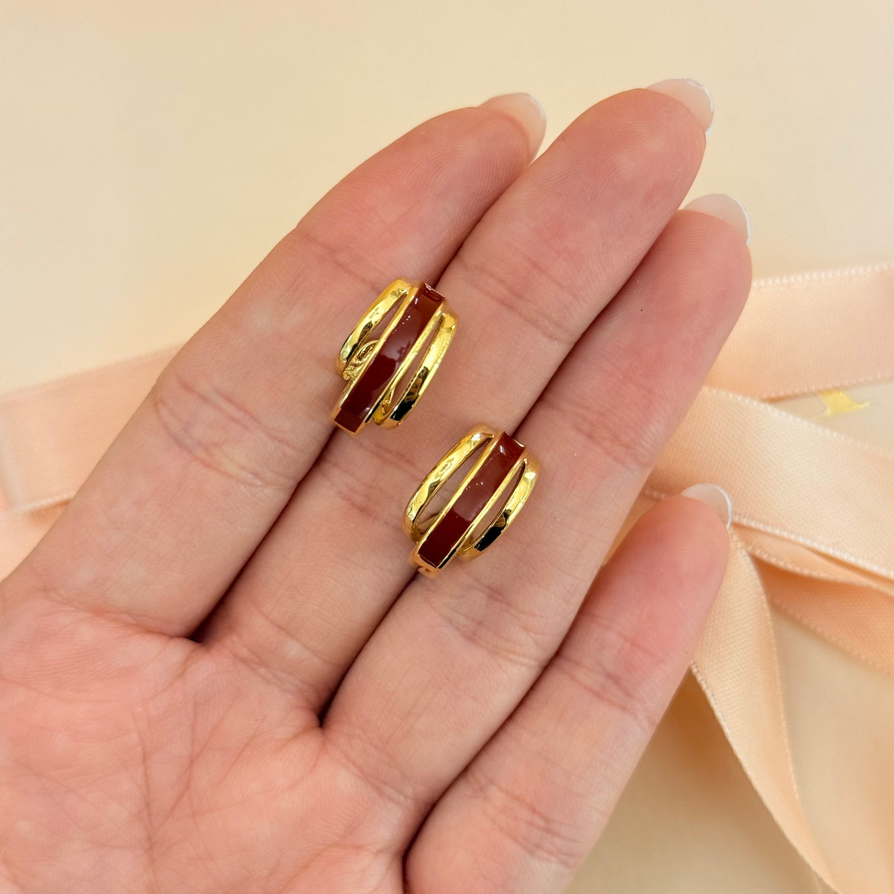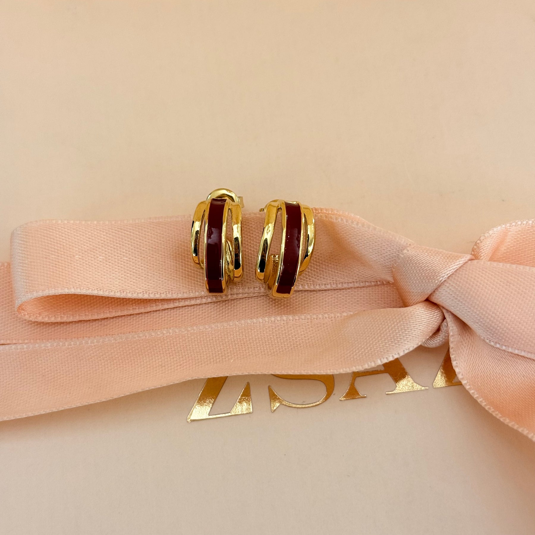 Upgrade your casual jewelry collection with our stylish dark red enamel half hoops. These versatile earrings feature a sleek black design with elegant gold plating, perfect for adding a touch of sophistication to any outfit. Elevate your look with these trendy and fashionable half hoops today!