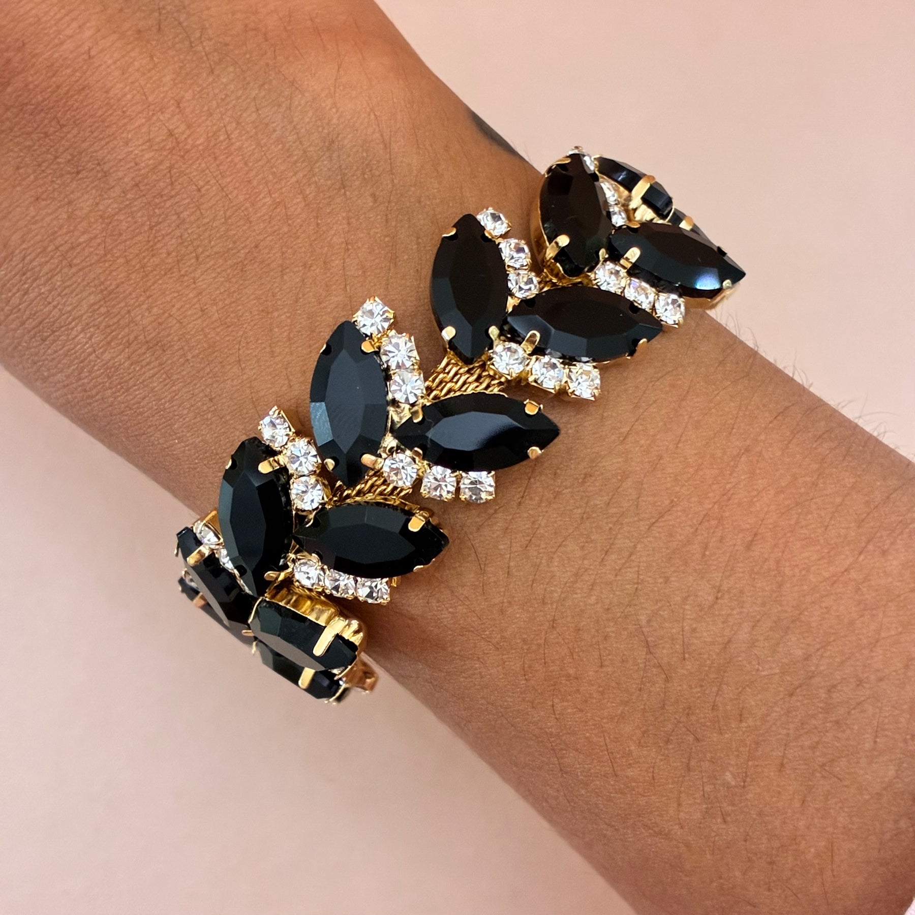 Introducing our Marquise black Swarovski crystals bracelet, a must-have for the elegant fashionista. The marquise design and black Swarovski crystals add a touch of sophistication, perfect for the winter season. Gold plated for a timeless finish. Elevate your style with this exquisite piece.