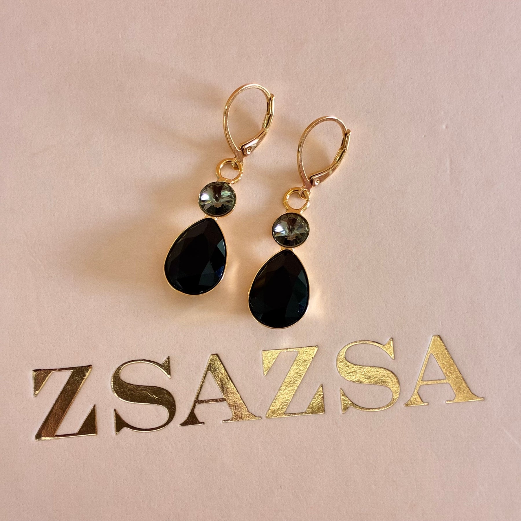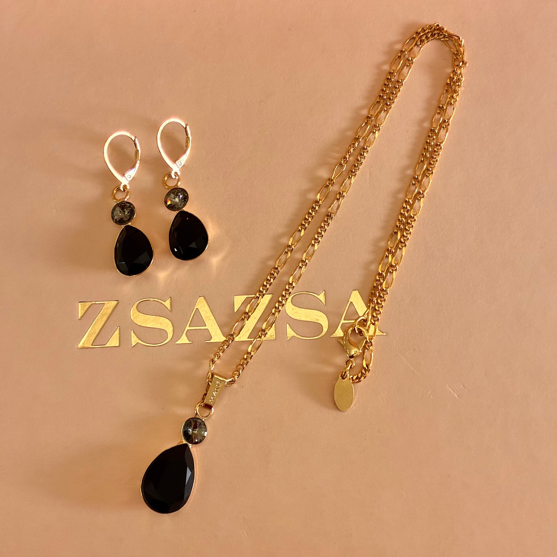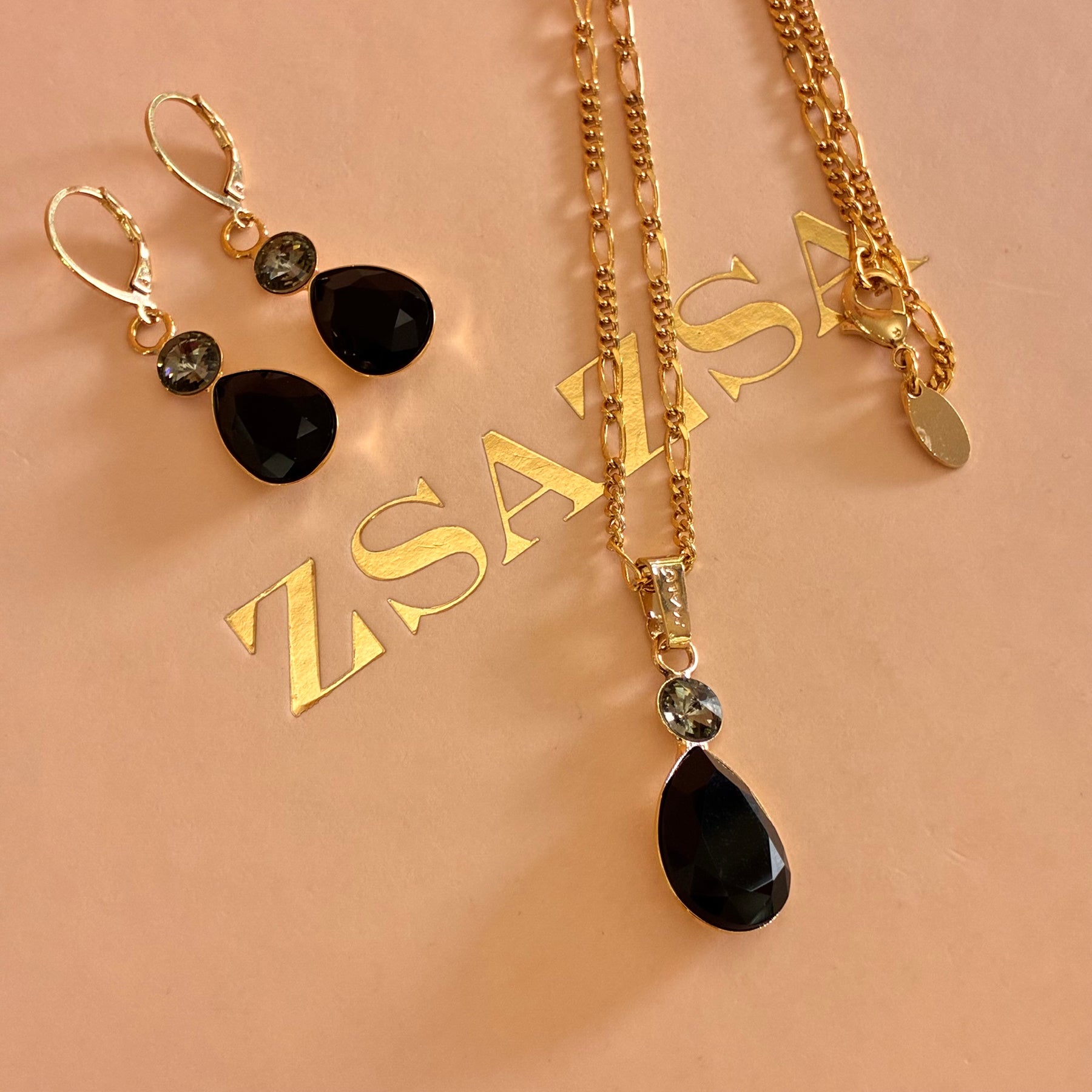 Enhance your style with our Teardrop Black and Grey Swarovski Crystals Set. With stunning black teardrop and grey round crystals, this set includes a teardrop pendant and hooks, all plated in gold for a touch of luxury. Elevate any outfit with these beautiful and unique accessories.