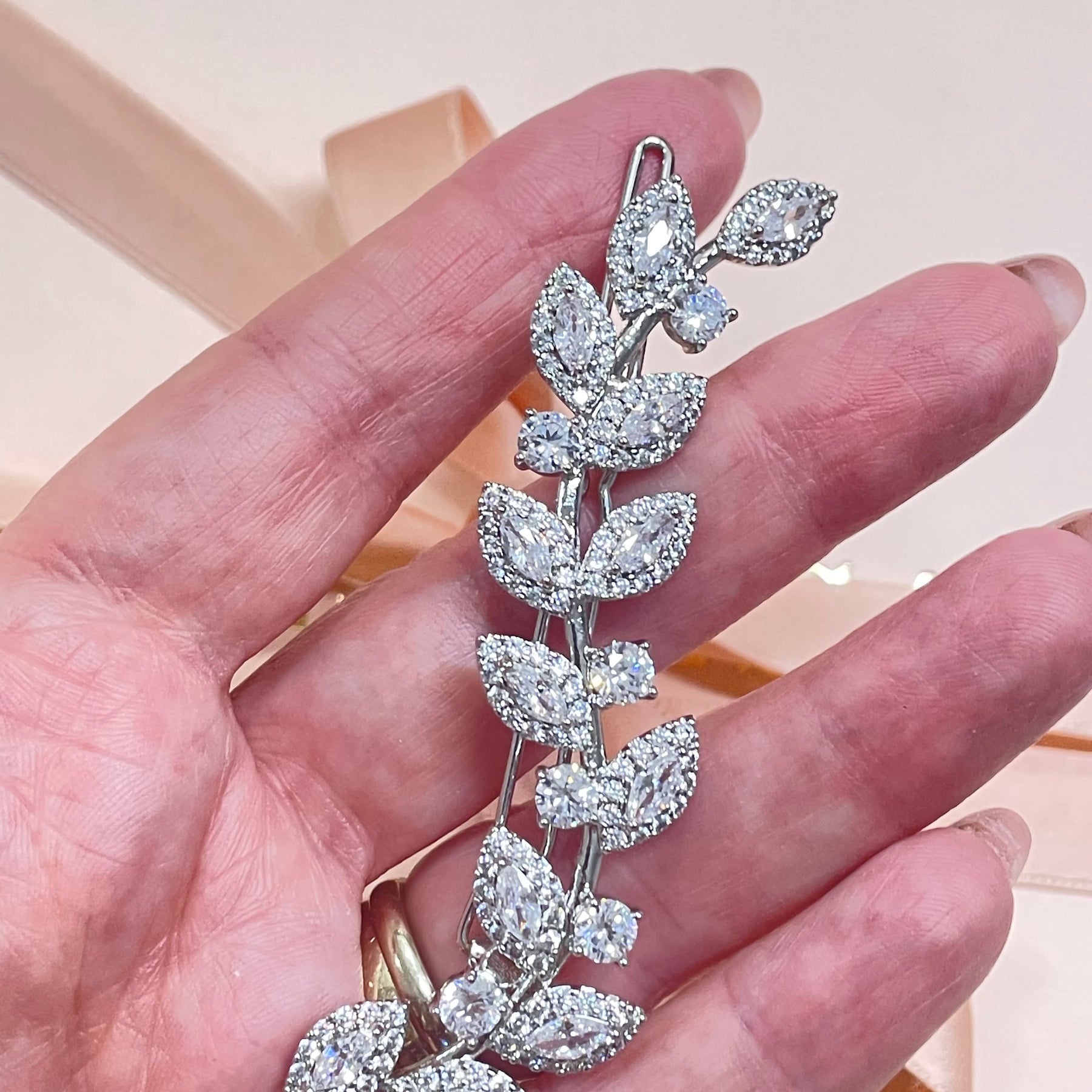 Upgrade your hair game with our high quality Silver Dainty Cubic Zirconia Leaf Hair Clip. This elegant and delicate piece adds a touch of sophistication to any upstyle. Perfect for special occasions, feel confident and stylish with this versatile accessory.