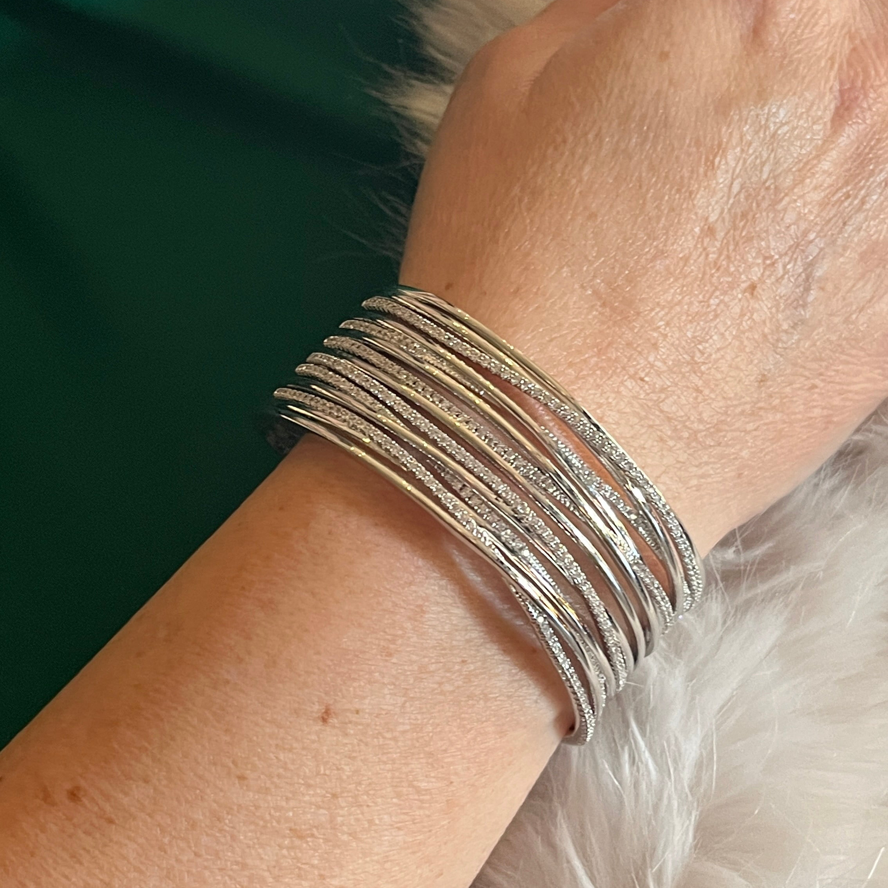 This stunning bangle is sure to catch attention with its white gold plated and crossed design. Made with high-quality Zircone, it adds a touch of elegance to any outfit. Shine bright with this exquisite piece.