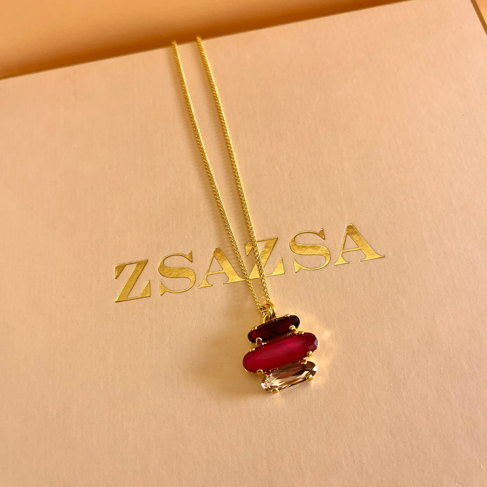 This pendant showcases a stunning blend of cherry red and dark red Swarovski crystals, beautifully set on a gold-plated base. Its rich hues bring a touch of warmth and elegance, while the gold plating adds a luxurious shine. Perfect for adding a refined pop of color to any outfit, this piece gently highlights your style with timeless charm.