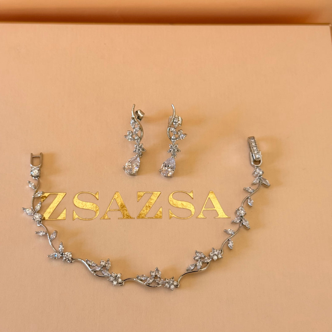 Teardrop and flower zircone silver earrings and bracelet