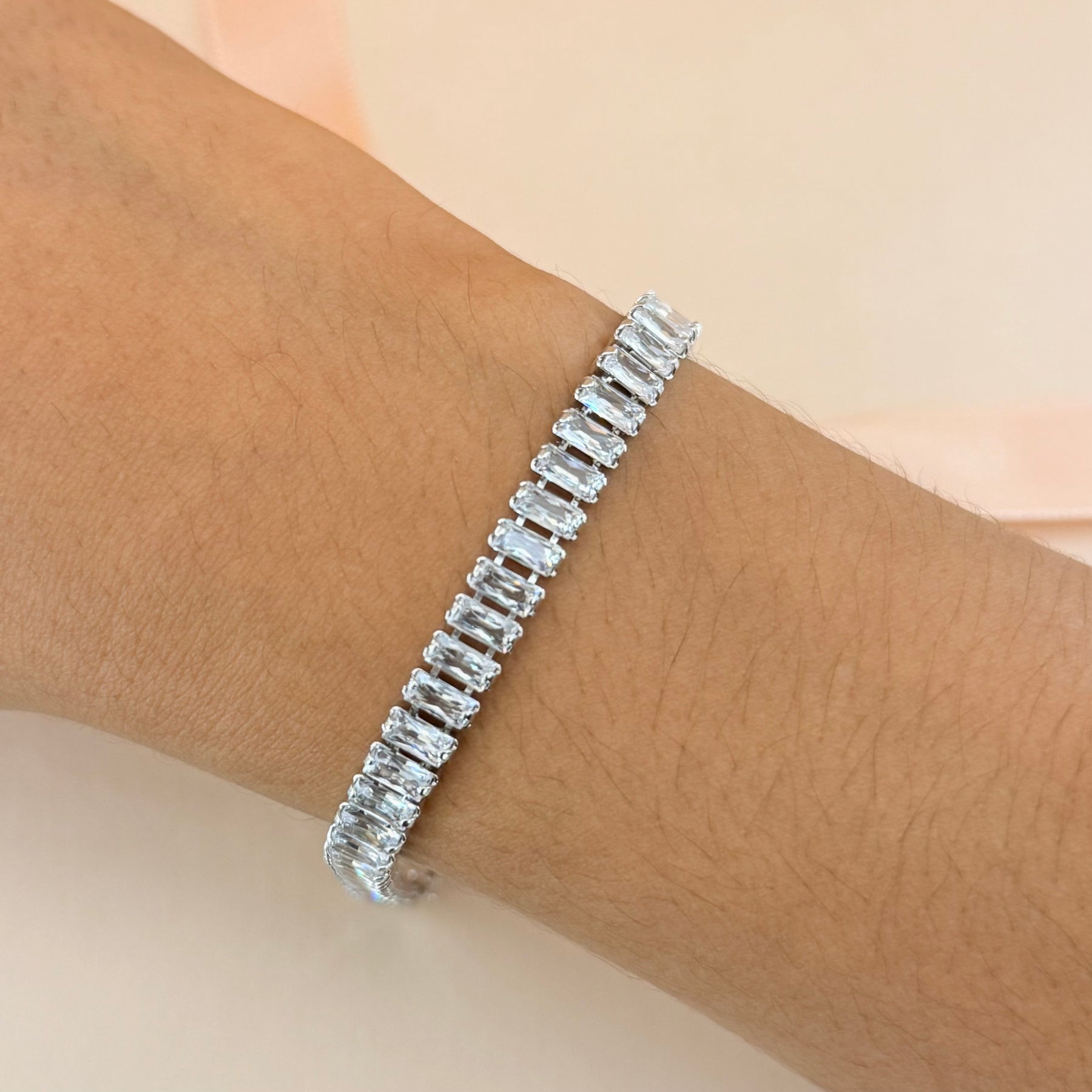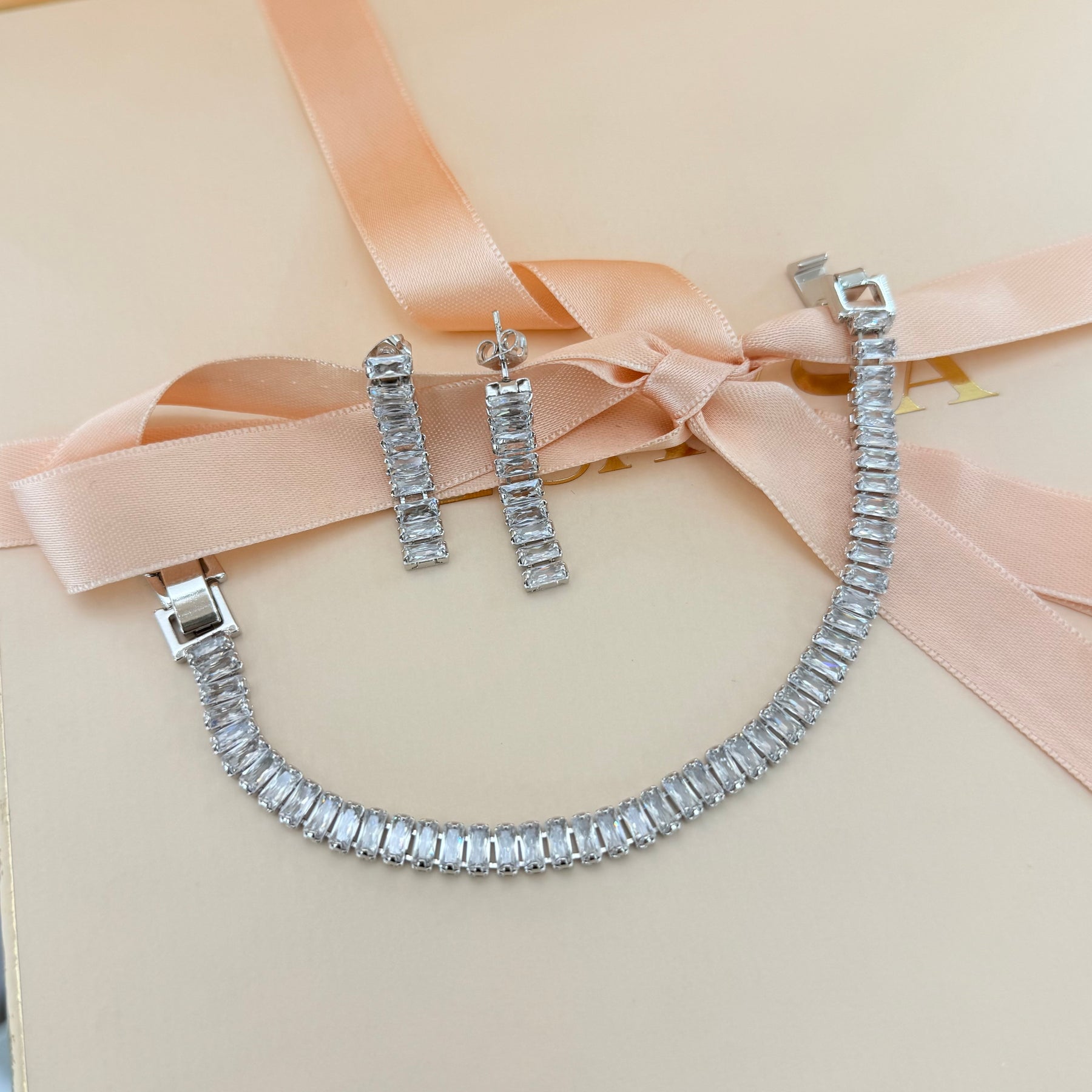 Upgrade your accessories with our Baguette Zircone Silver Earrings and Bracelet Set. These white gold-plated pieces are not only elegant but also versatile, perfect for any occasion. Make a statement with these stunning baguette zircone jewelry pieces and elevate your style.