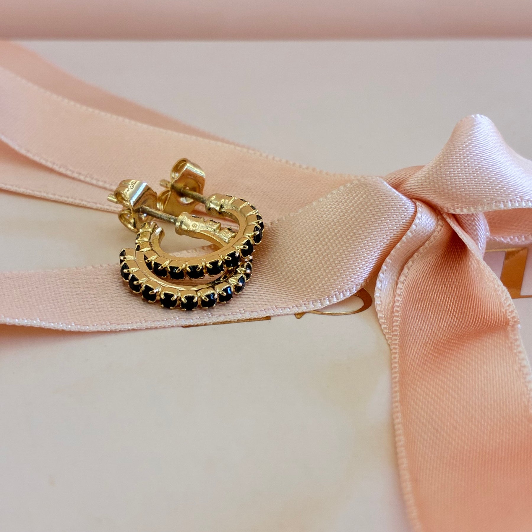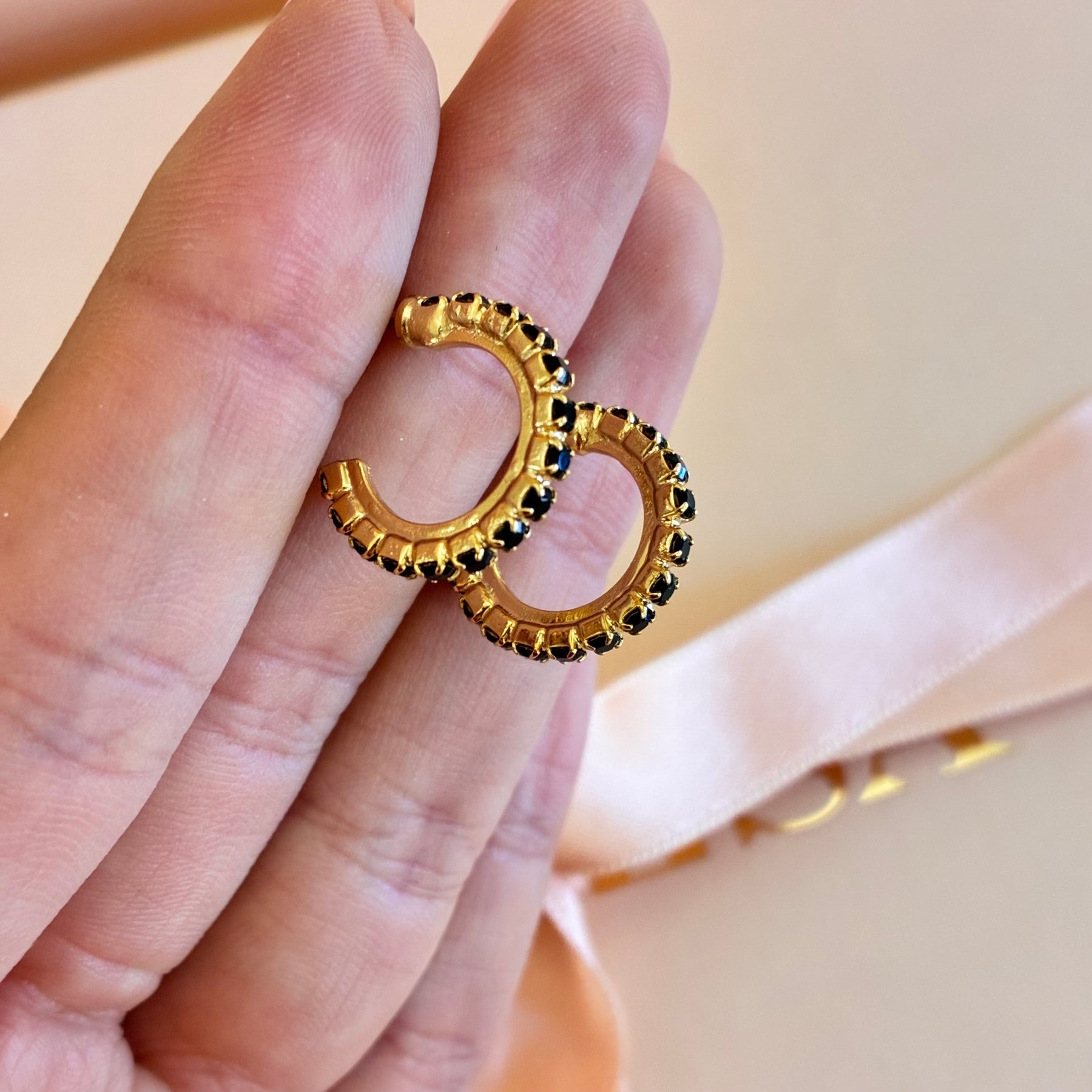 Embrace elegance and sparkle with our black preciosa crystal hoops! These dainty hoops feature stunning black crystals and are plated in gold for a touch of luxury. Elevate any outfit with these versatile and eye-catching earrings.