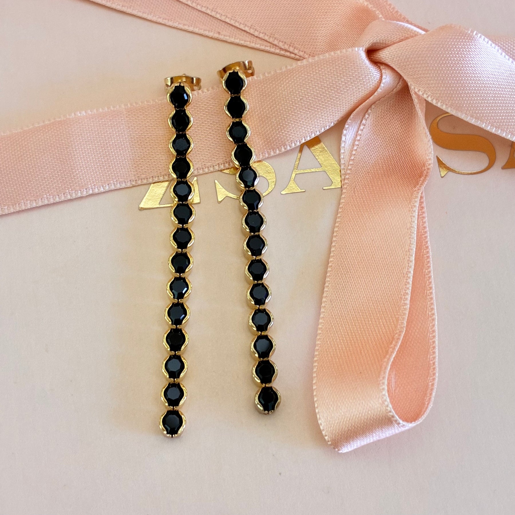 Elevate your style with these stunning black preciosa crystal earrings. The long, gold plated design adds elegance and sophistication to any occasion. Stand out and make a statement with these beautiful earrings.