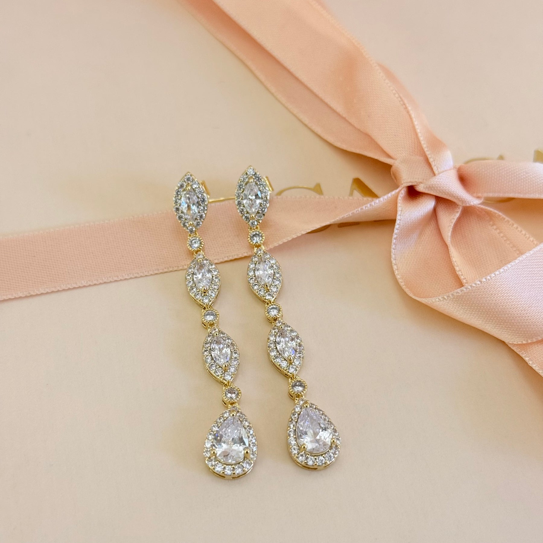 These elegant gold plated earrings feature marquise and teardrop zircones, making them perfect for brides and special occasions. The long design adds a touch of classic sophistication. Elevate any outfit with these beautifully crafted earrings.