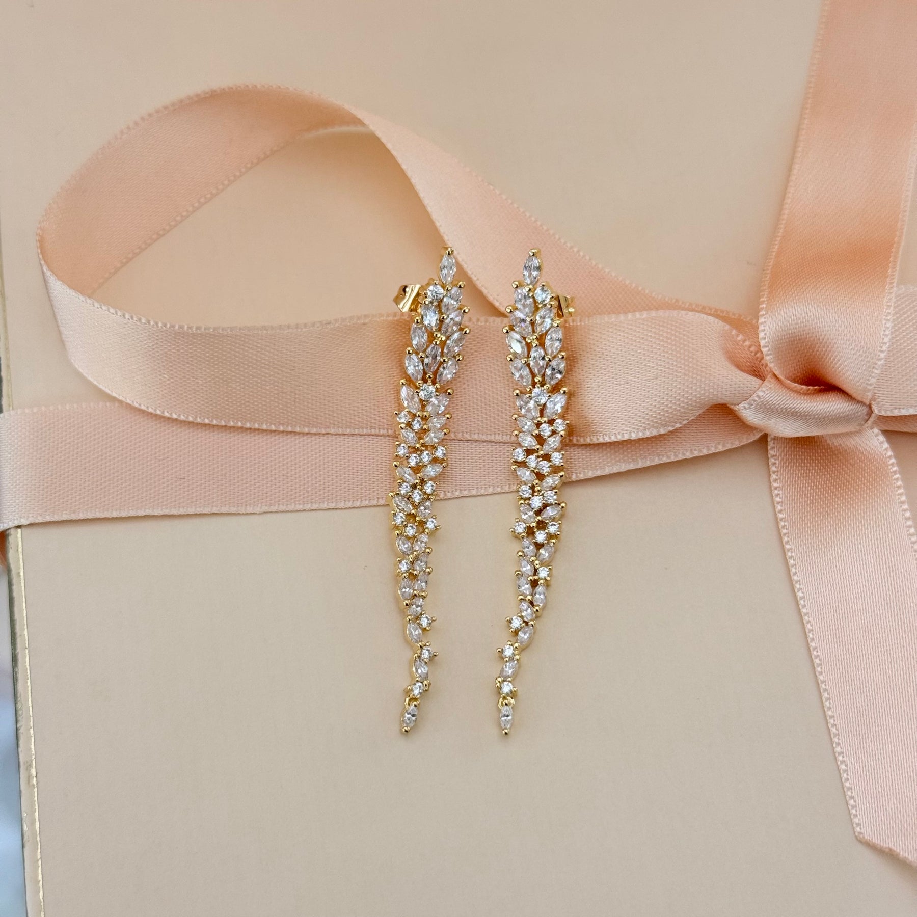 Elevate your look with our long marquise zircone gold plated earrings. Perfect for special occasions, these elegant earrings add a touch of glamour to any outfit. Whether you're a bride, mother of the bride or groom, or just looking for a beautiful accessory, these earrings are a must-have.
