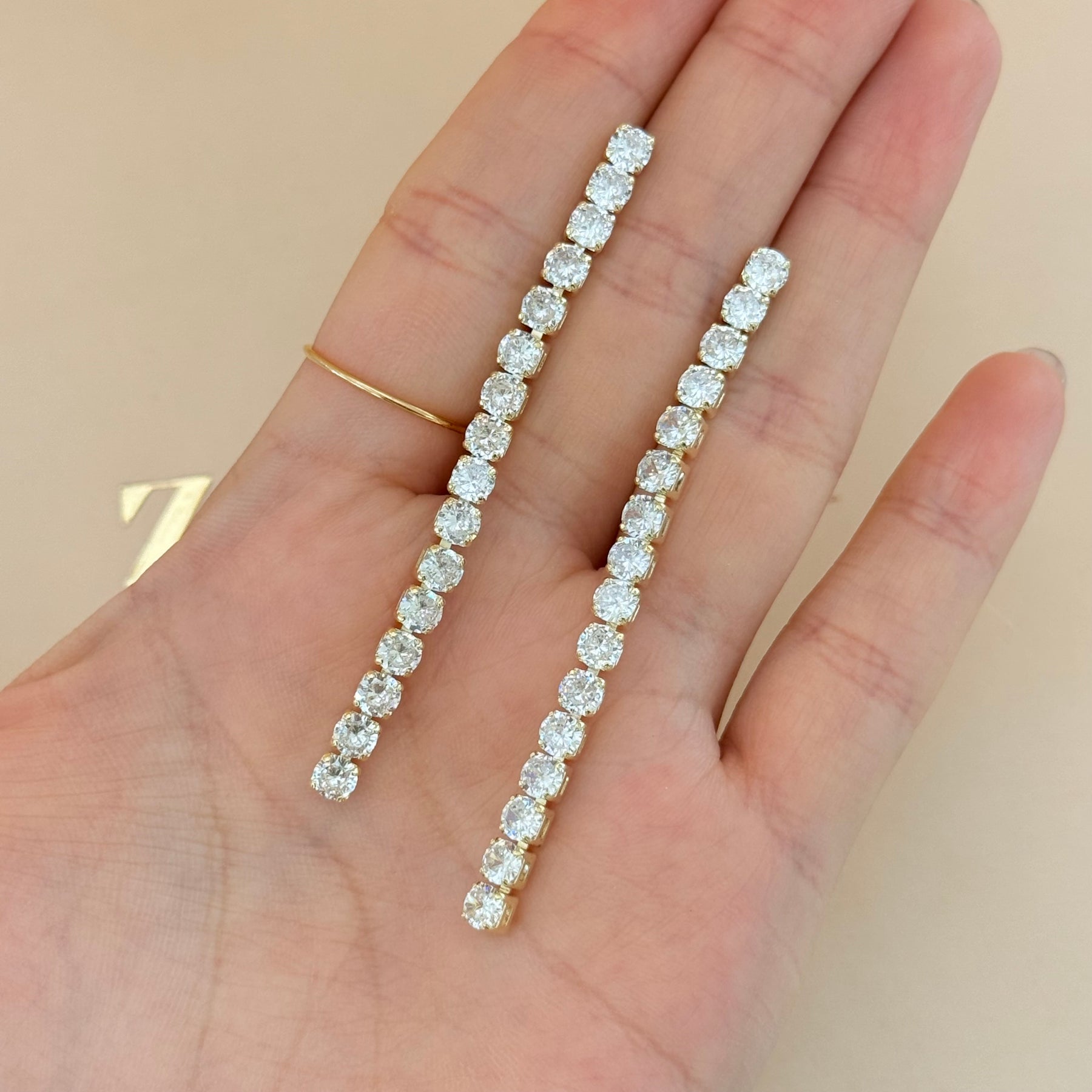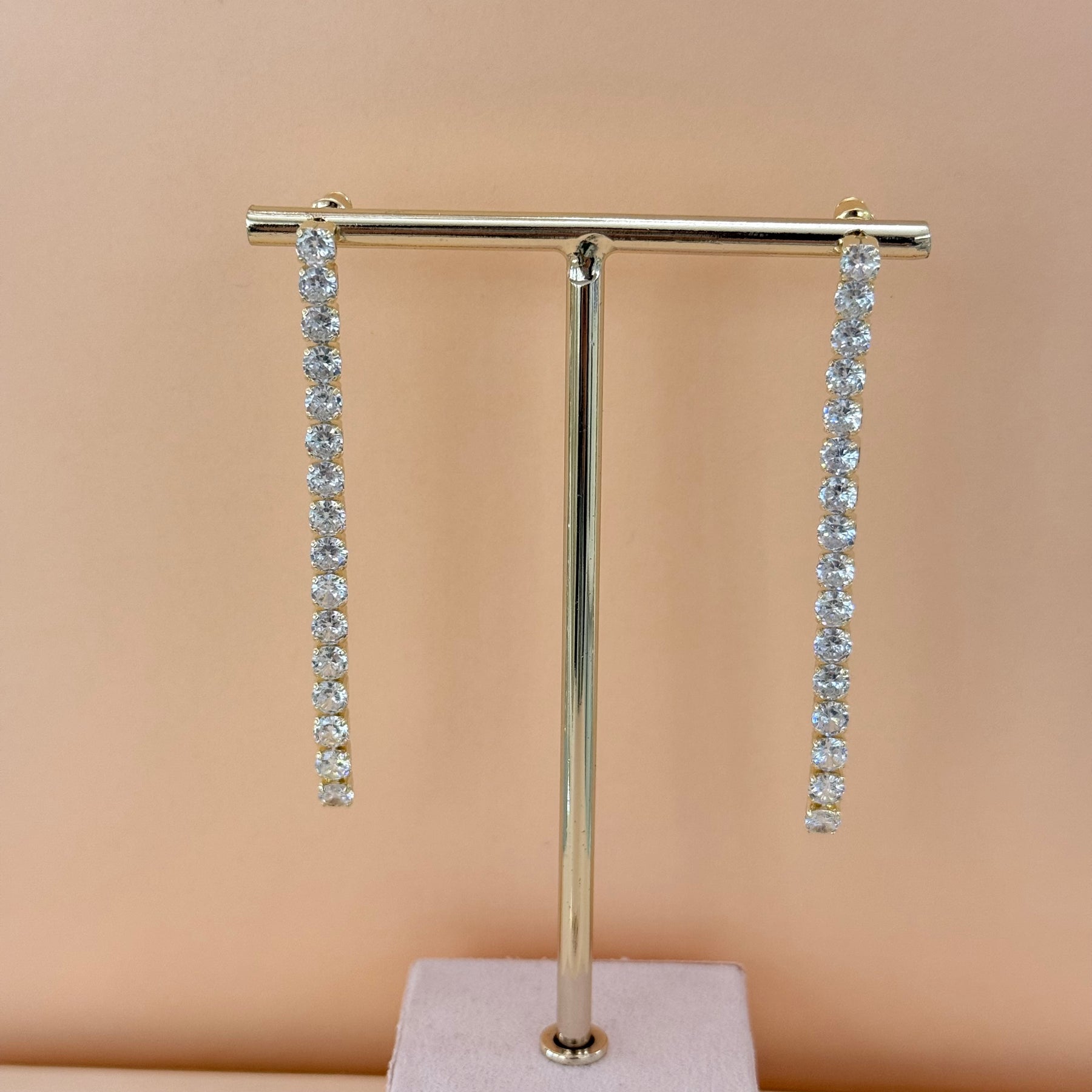 Elevate your style with our long tennis zircon gold plated earrings. These earrings feature stunning zircon stones, delicately plated in gold. Their simple and elegant design makes them perfect for any occasion. Add a touch of luxury to your look with our must-have earrings.