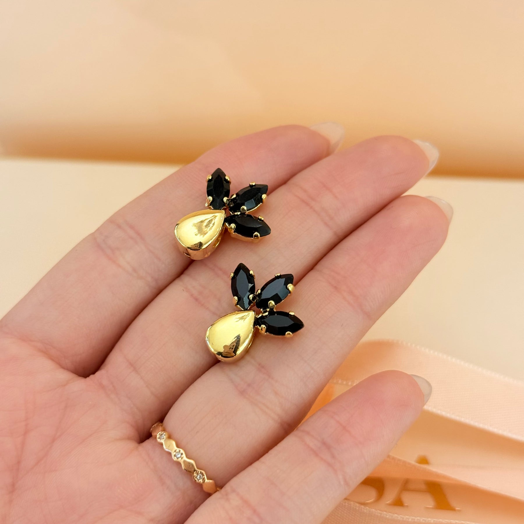 These Marquise Black Swarovski Crystal Gold Plated Earrings effortlessly combine casual and elegant elements, making them the perfect addition to any outfit. The intricate black marquise design, adorned with high-quality Swarovski crystals, adds a touch of sophistication to your look. This must-have piece from our new collection is sure to elevate your style.