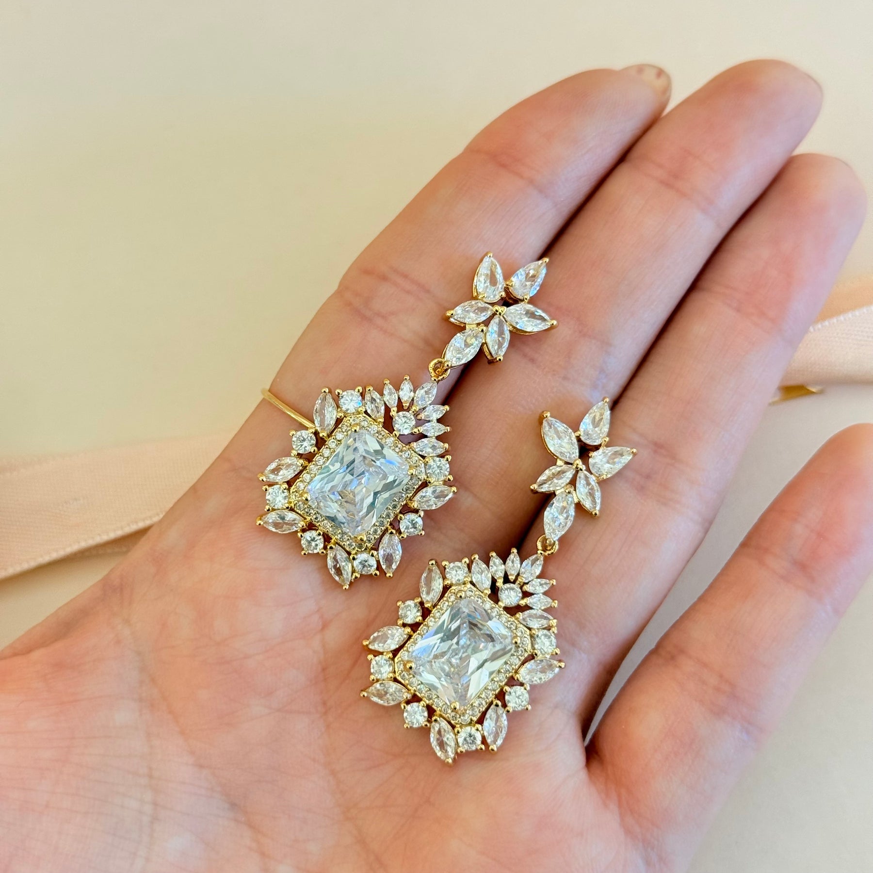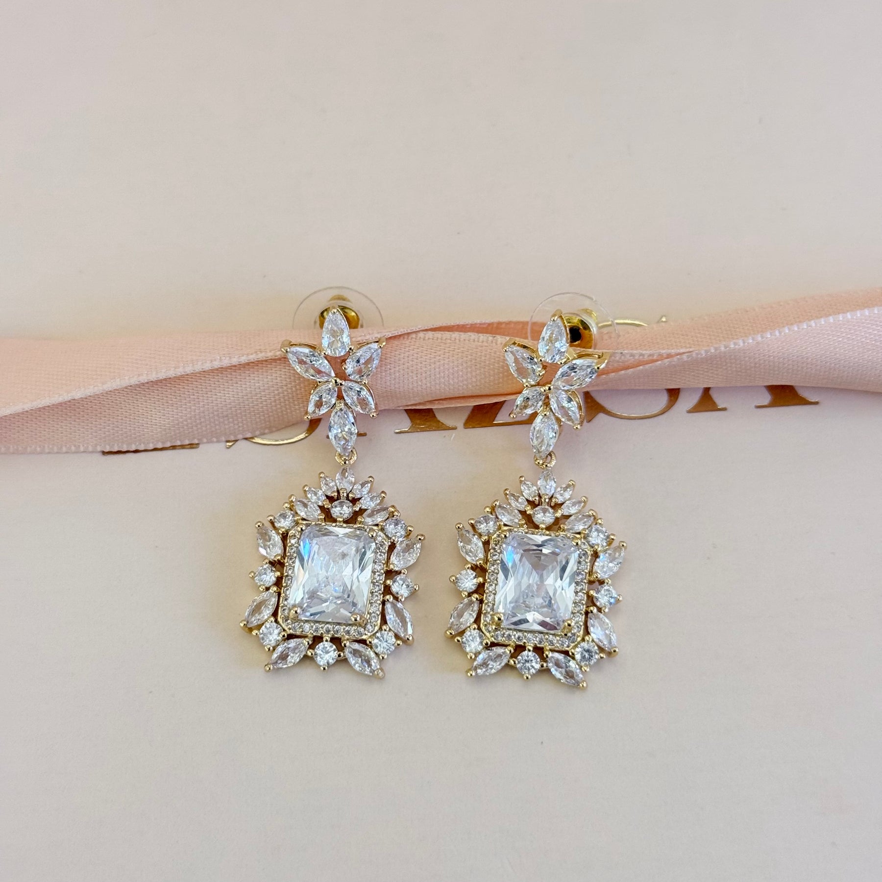 Elevate your style with these elegant rectangular and marquise gold plated zircon earrings. Classic yet modern, they add a touch of sophistication to any look. Beautifully designed, they are perfect for any occasion.