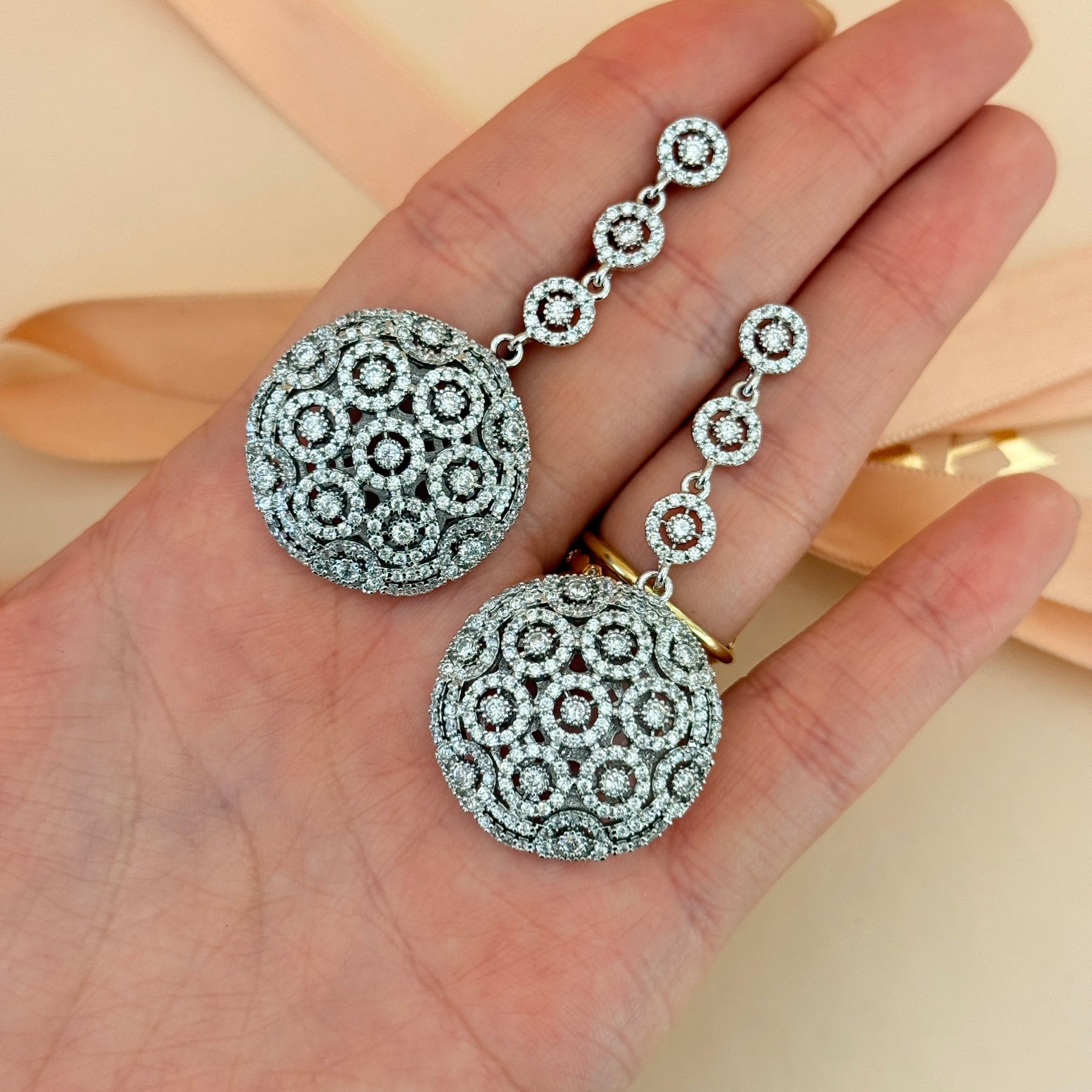 Elevate your elegance with these Round Zircone Silver Long Earrings. Perfect for weddings or special occasions, their stunning white gold plating and intricate zircone design make them a beautiful choice for brides and mothers alike. Shine brightly and feel confident on your special day!