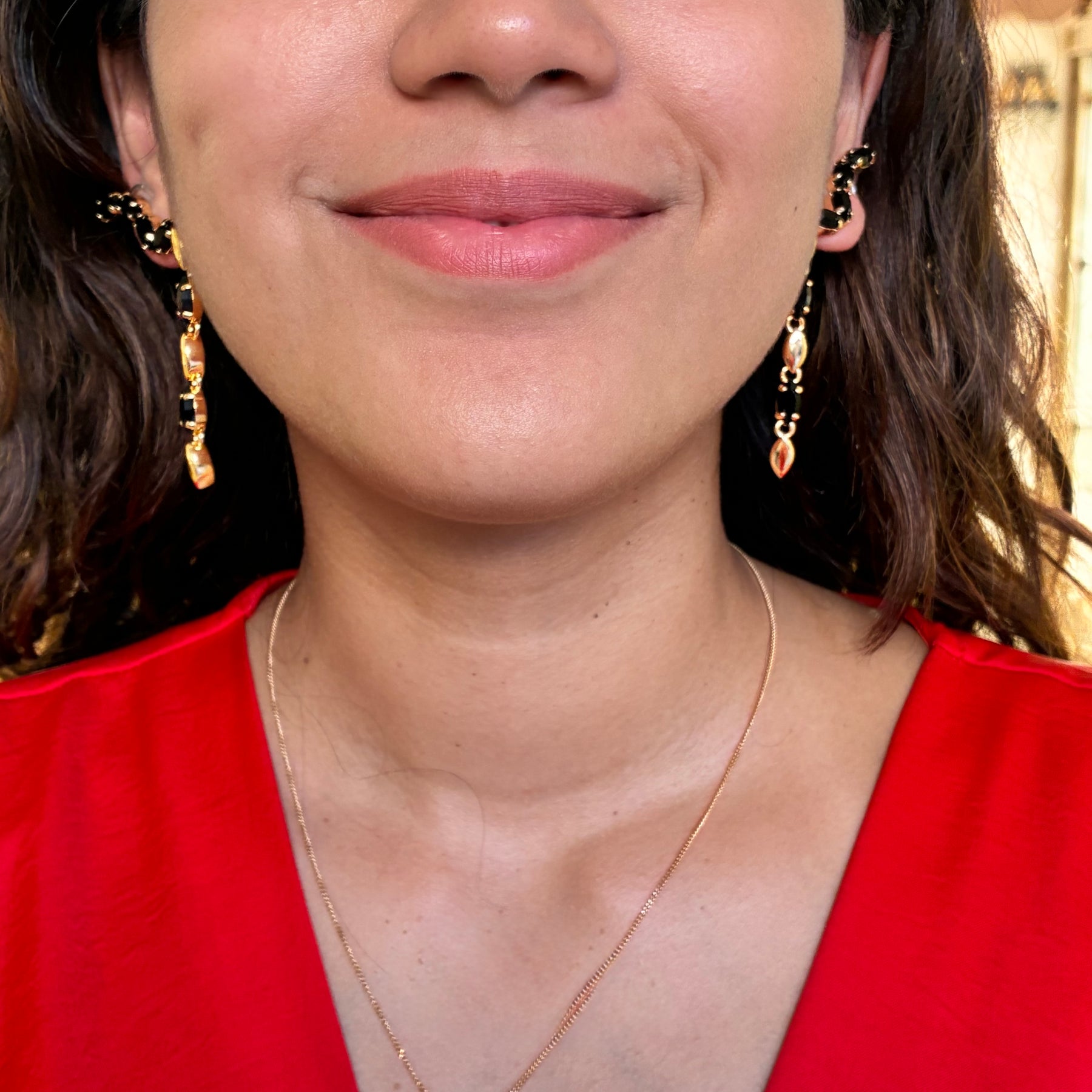 Elevate your style with our statement marquise Black earrings. Adorned with dazzling Swarovski crystals, these earrings add a touch of glamour to any outfit. The elegant marquise design is complemented by the warm gold plating, making them perfect for any occasion. Stand out from the crowd with these unique earrings.