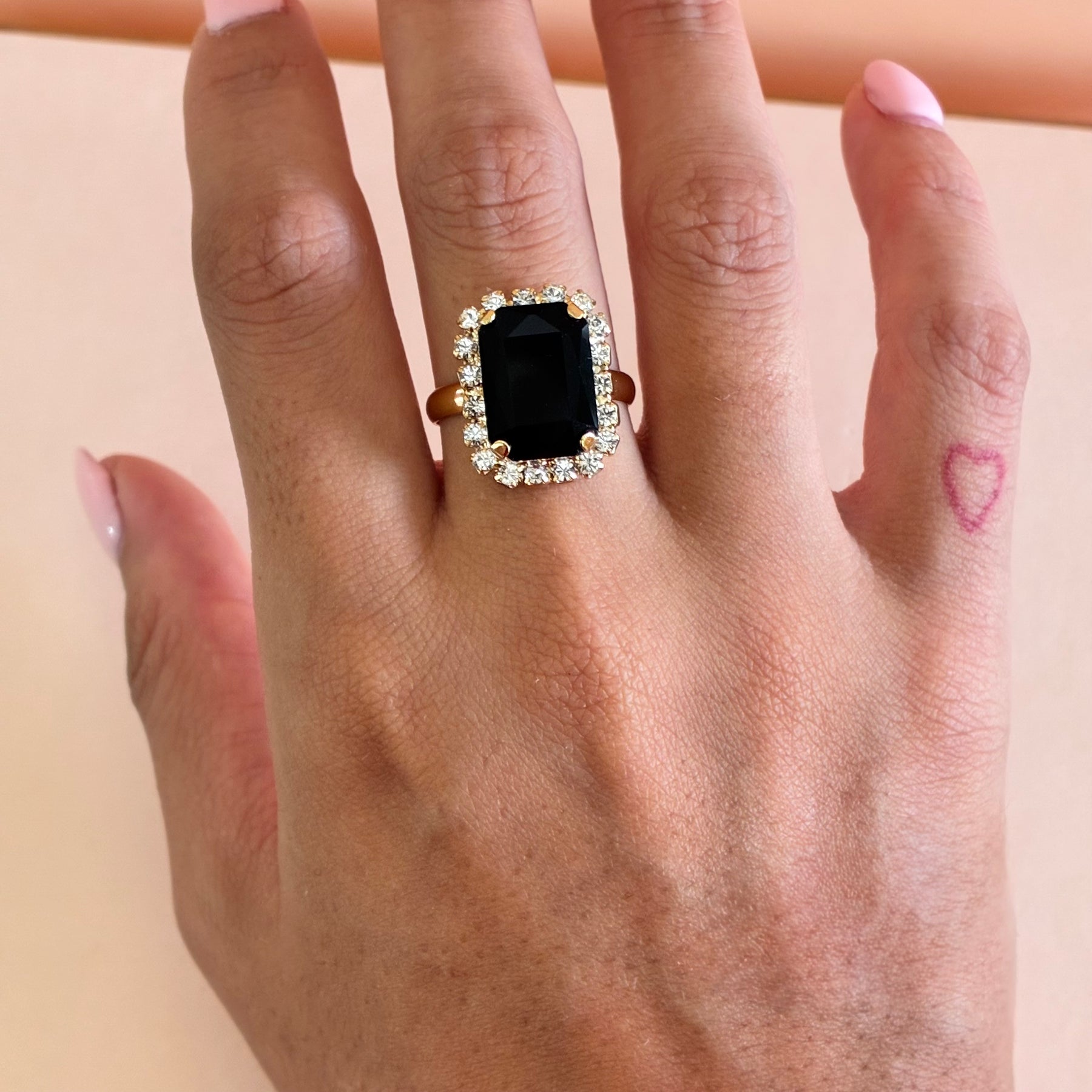 Elevate any outfit with our rectangular black gold plated pendant set. The classic and dainty design, featuring stunning black preciosa stones, adds a touch of elegance and sophistication to your look. Perfect for any occasion, this pendant set is a must-have for every fashion-forward individual.