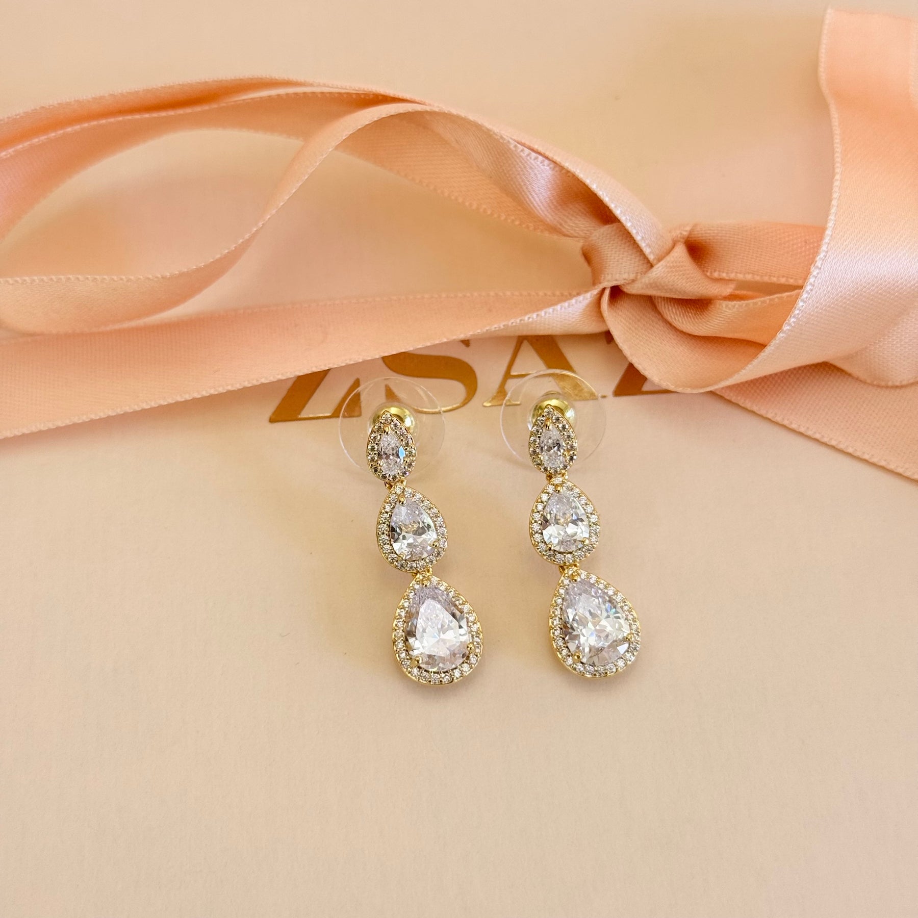 Enhance any occasion with these elegant Teardrops zircone gold plated earrings. Featuring a triple teardrop design, they add a touch of sophistication to any outfit. Perfect for brides, mothers of the bride and groom, or any special occasion. Elevate your look with these beautiful earrings.