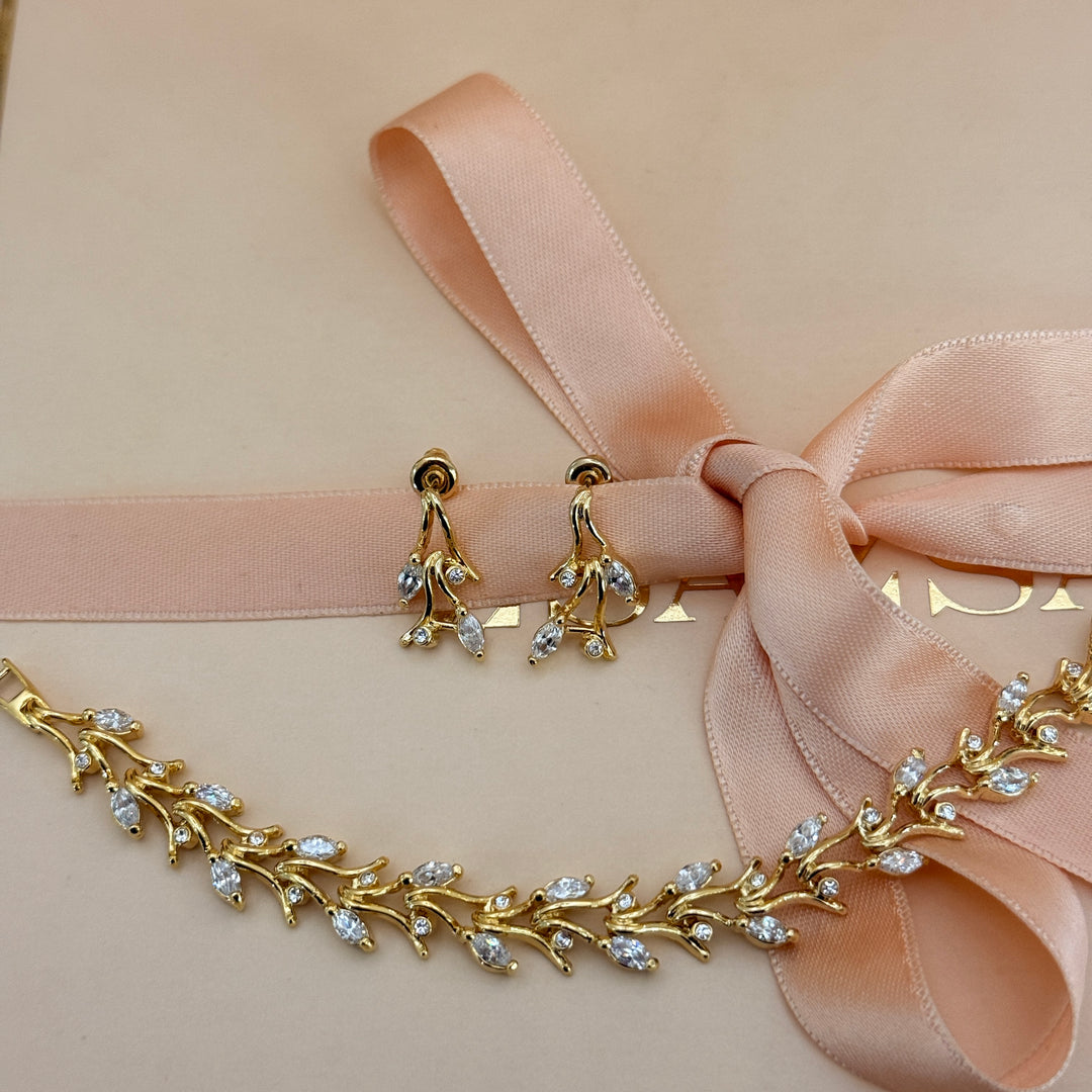 Teardrop and leaves zircone gold plated earrings and bracelet set