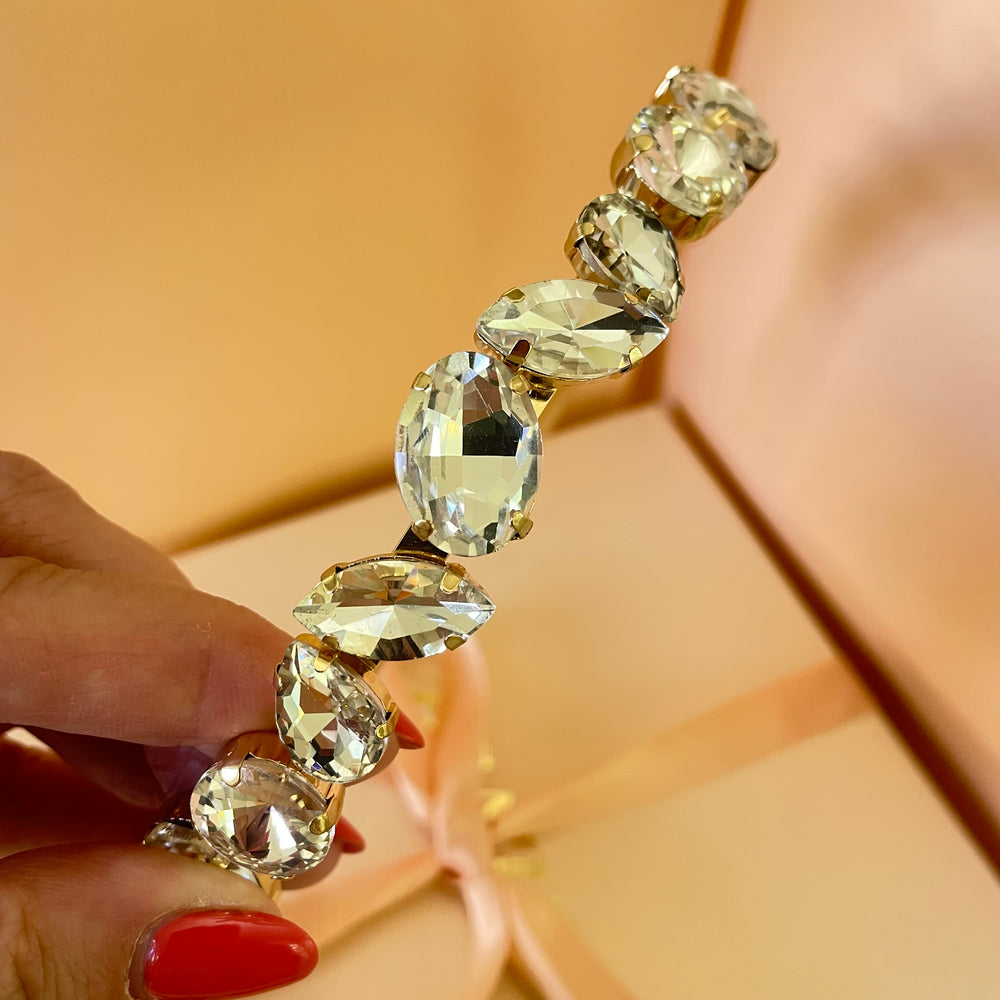 Streamline your look with our Big Stones Headband. Featuring a luxurious gold base and eye-catching rhinestones, this headband is the perfect accessory for any occasion. Elevate your style with this statement piece and make a lasting impression.