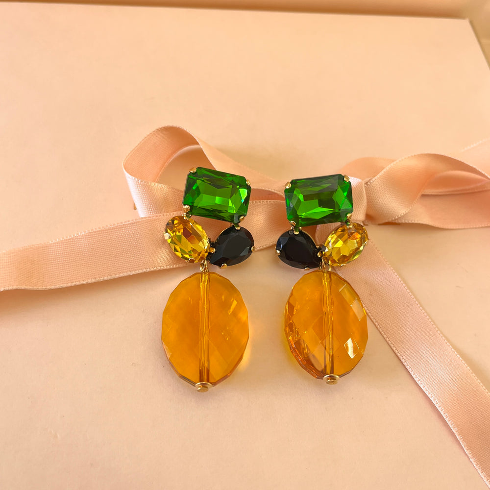 Elevate your casual style with our resin and preciosa crystals earrings featuring stunning multicolour Preciosa crystals in green, yellow, and black. The gold plated design adds a touch of elegance, making these earrings perfect for any occasion. Stand out and make a statement with these unique and beautiful earrings.