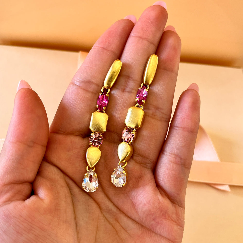 Add a touch of glamour to any outfit with these stunning shades of pink Swarovski Crystal set! Featuring multi shapes of crystals with a fuchsia, light pink and mauve hue, these gold plated set is perfect for making a statement and catching the light. Elevate your style with these elegant and eye-catching earrings and bracelet.