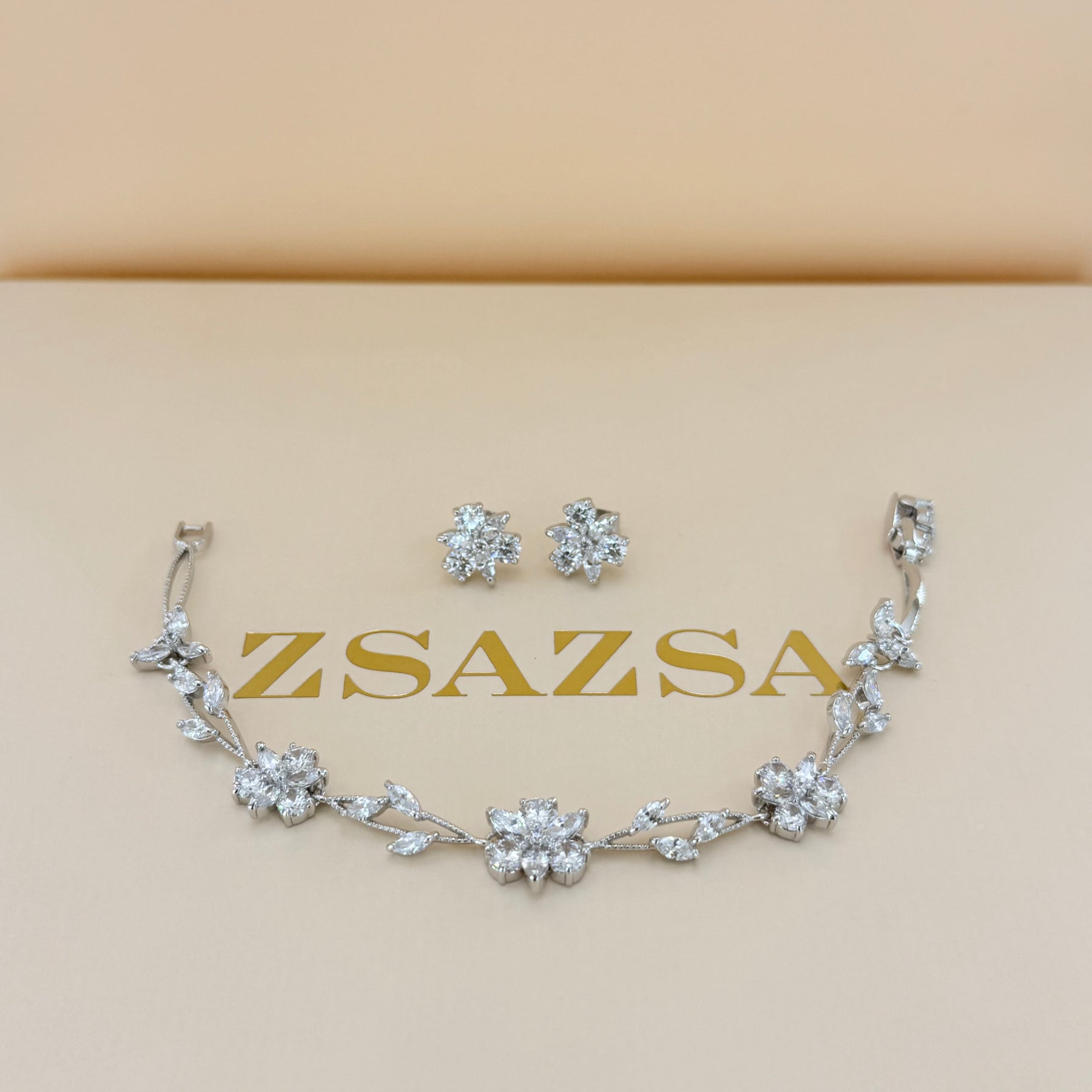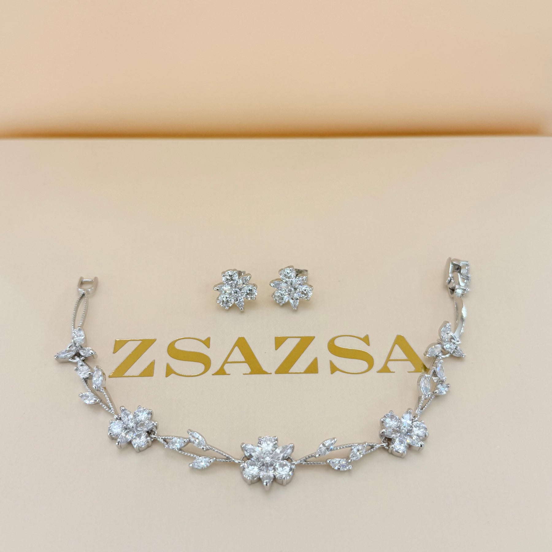 This stunning set features beautiful and elegant flower zircones in both the earrings and bracelet. Perfect for special occasions such as weddings and for brides looking for a touch of sparkle on their big day. Elevate any outfit with this exquisite set.