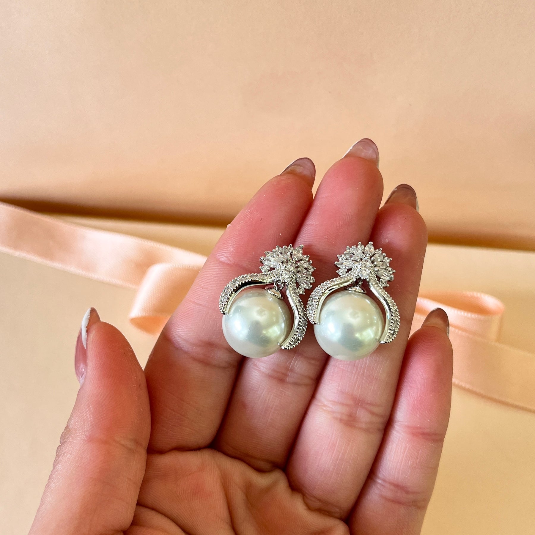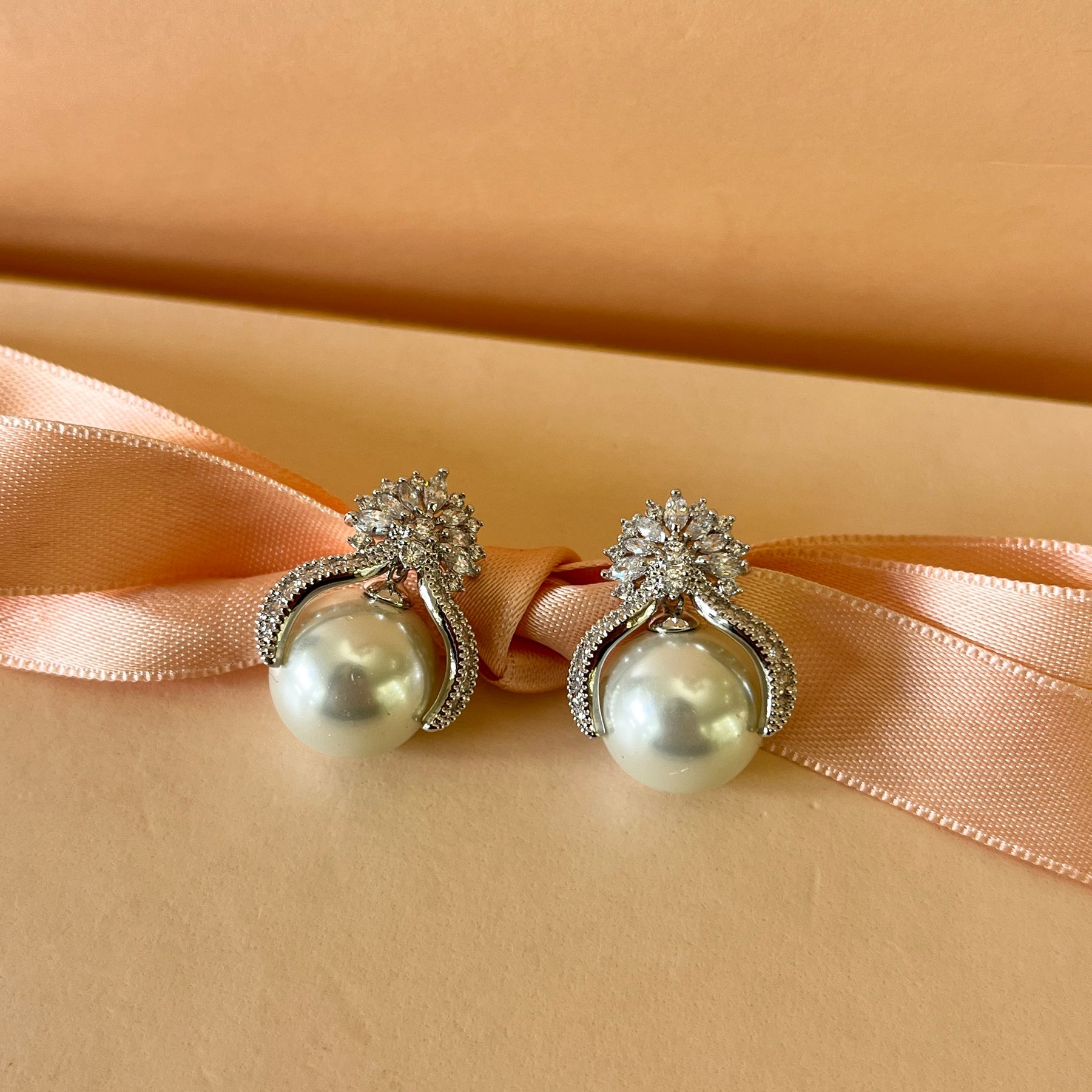 Marquise zircone and white pearls white gold plated studs