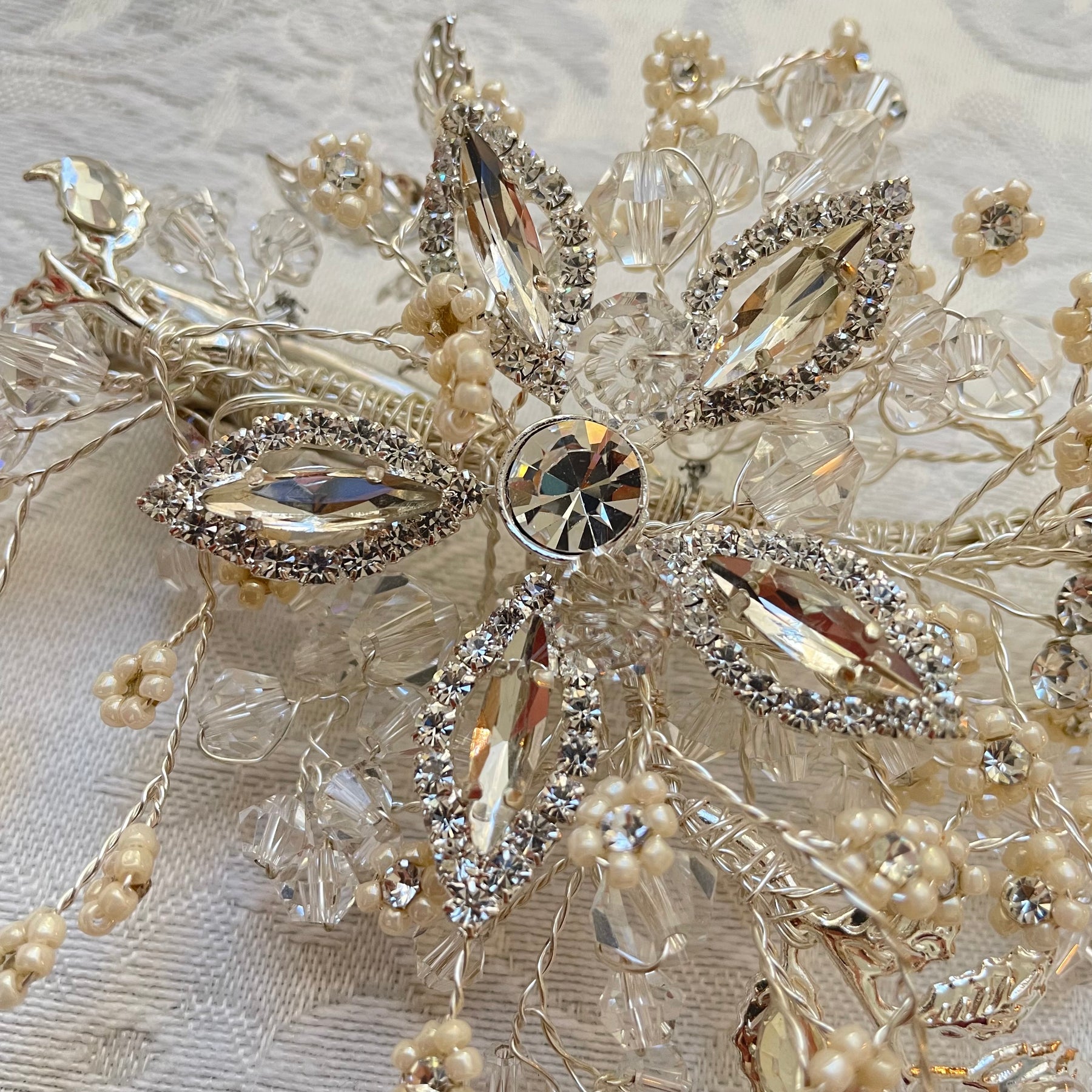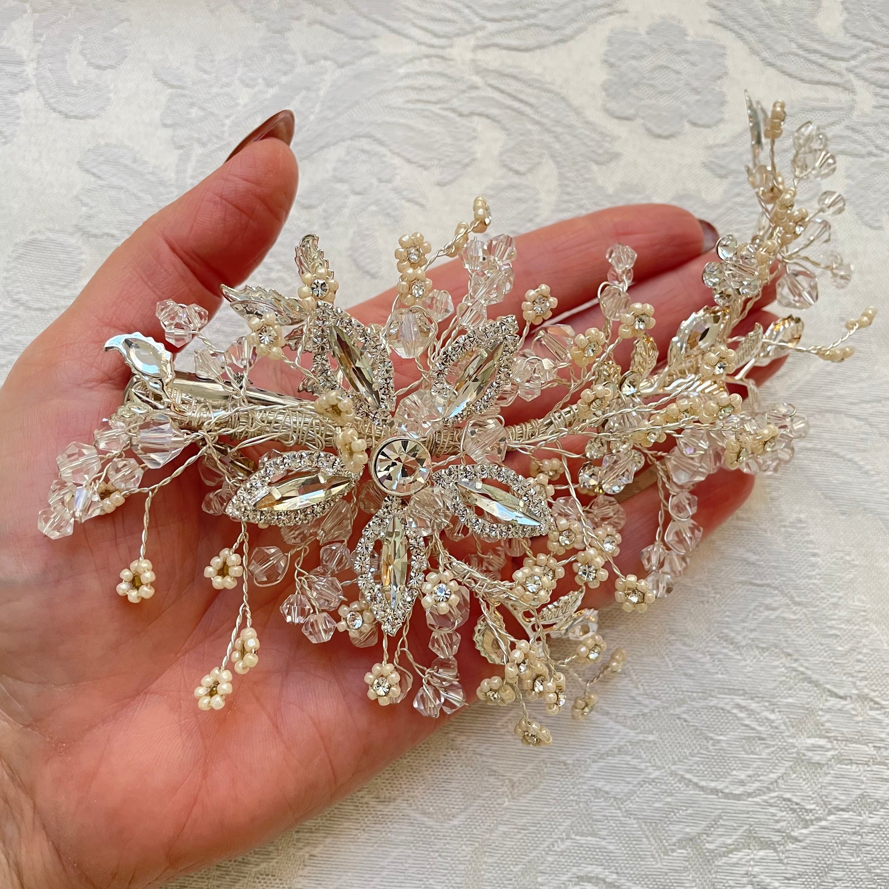 This handmade headpiece features a design of silver and pearls, secured with an alligator clip for stability. Ideal for weddings, it offers an elegant accessory option to enhance formal attire, providing both aesthetic appeal and reliable wear throughout the ceremony.