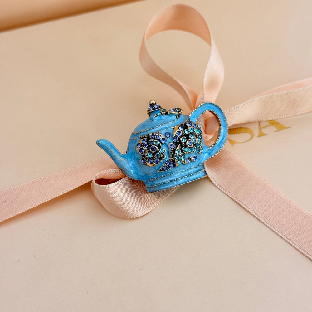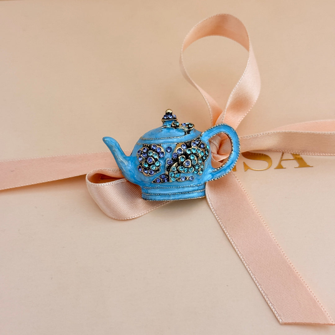 Teapot turquoise rhinestone brooch