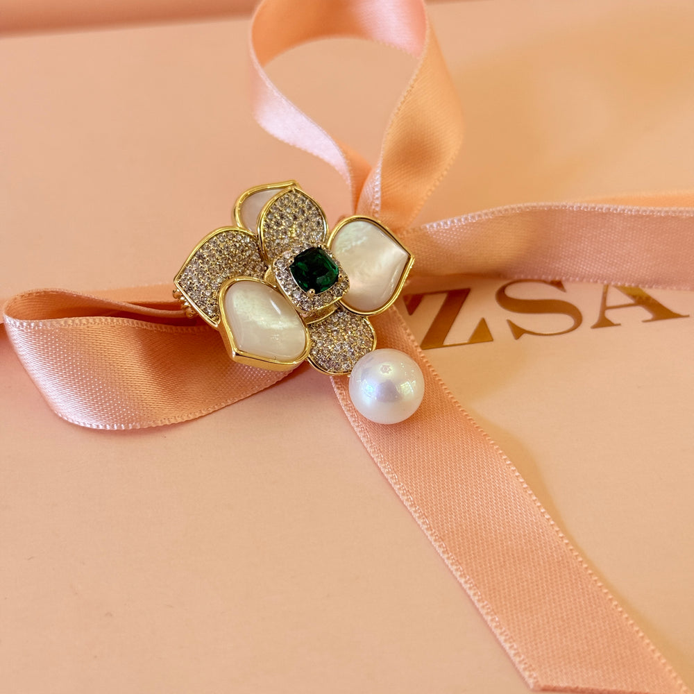 Green zircone and pearl flower gold plated brooch