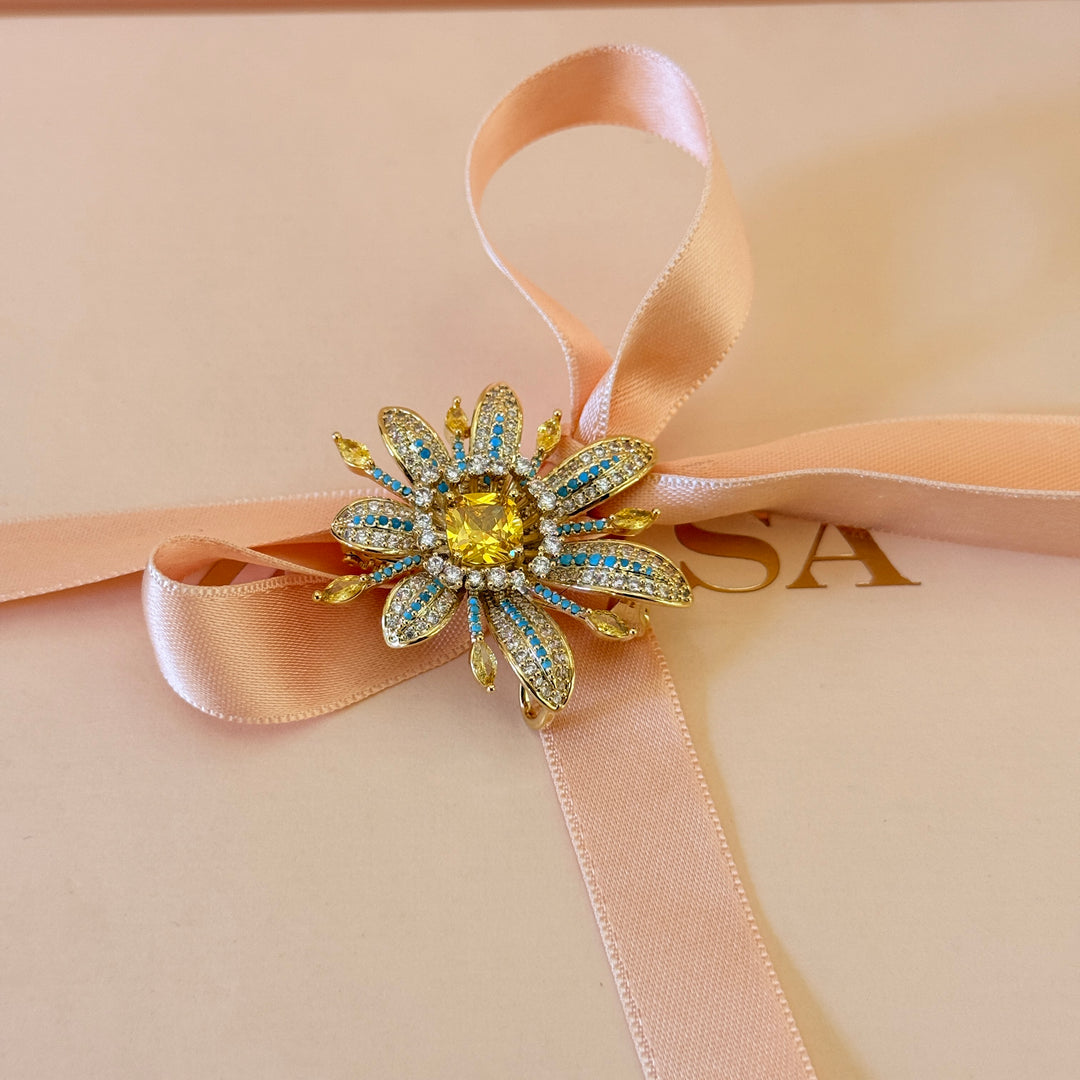 Yellow and turquoise zircone gold plated brooch