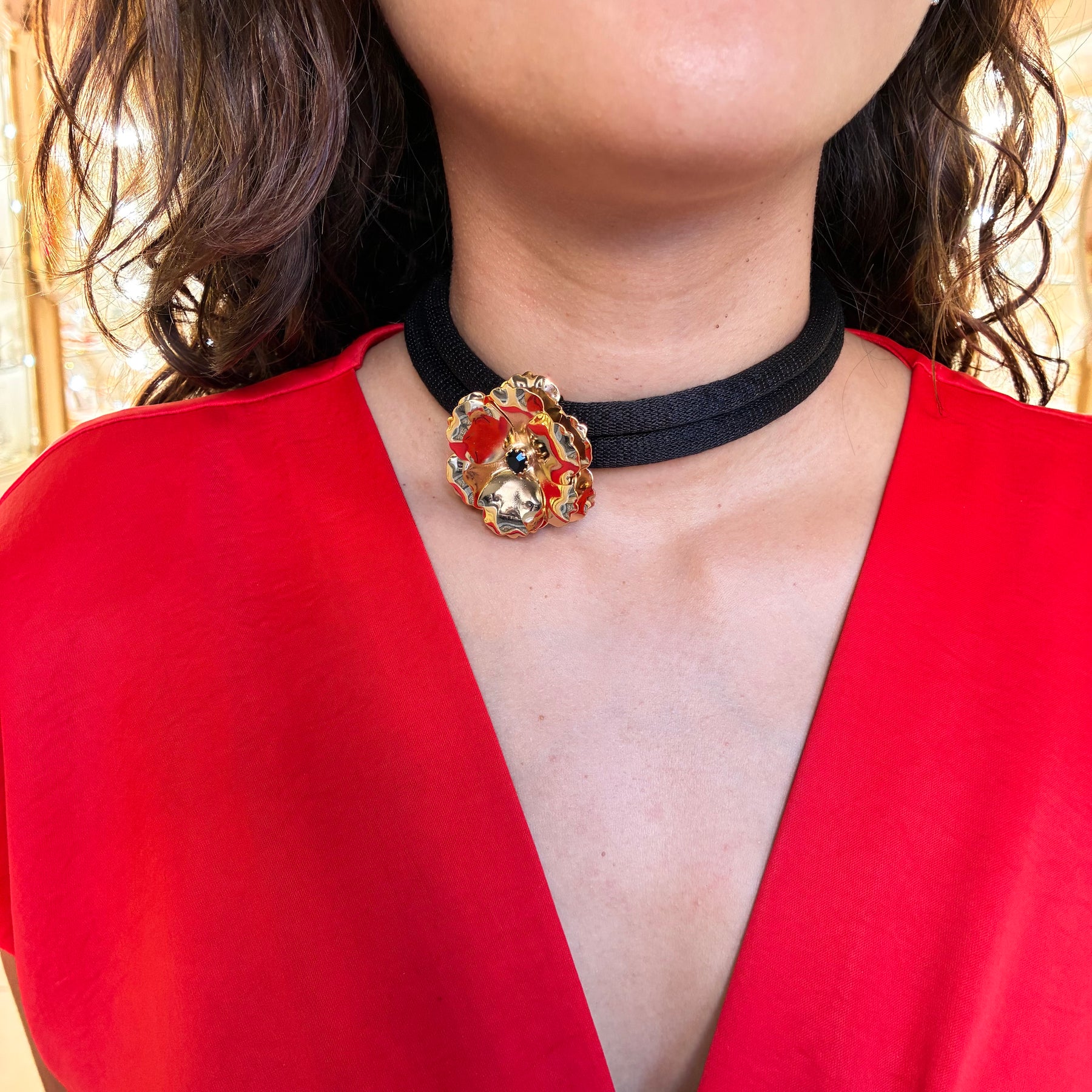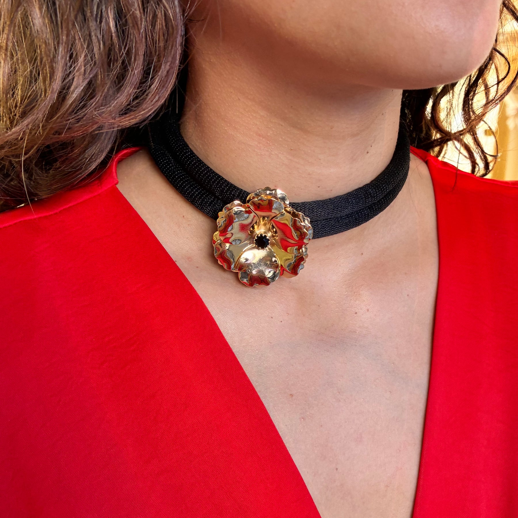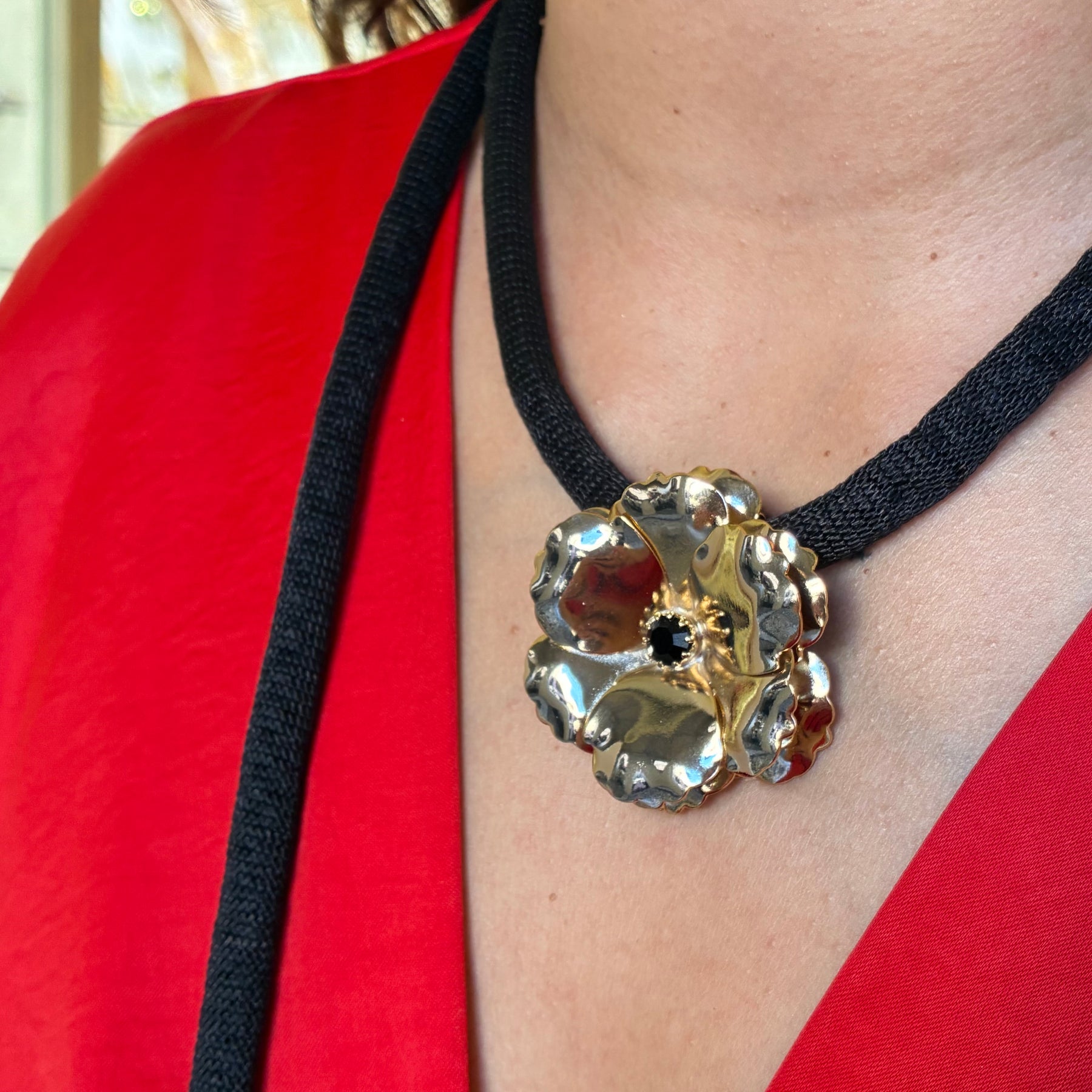 Elevate your look with our elegant black silk cord necklace, featuring a stunning flower pendant in gold plating adorned with Preciosa crystals. Versatile for any occasion and effortlessly chic, this piece is a must-have for any fashion-forward individual. Indulge in luxury and style today!