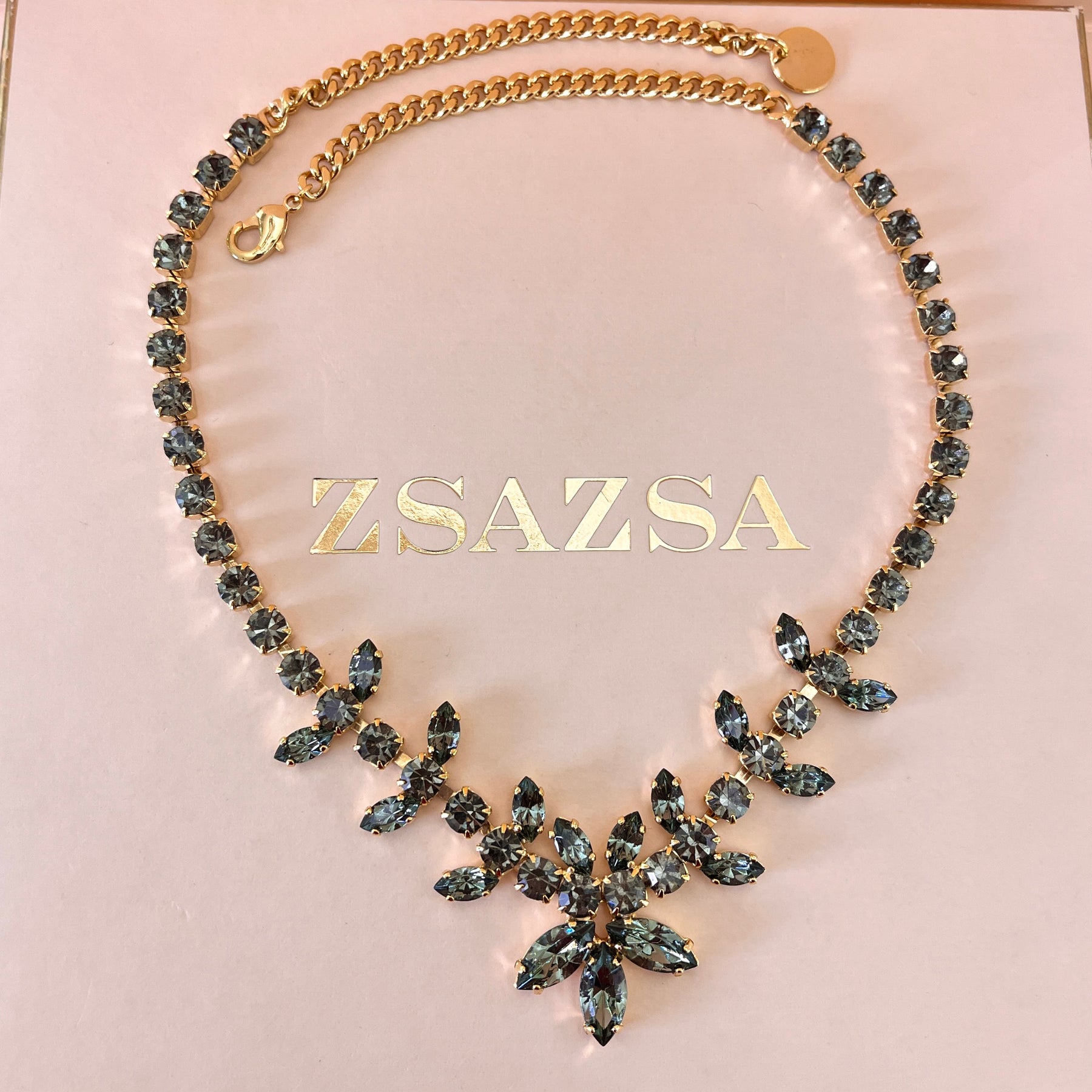 Enchant your look with our stunning Grey preciosa Crystals necklace. Handcrafted with marquise and round shaped stones, this necklace boasts a delicate leaf design for a touch of elegance. Perfect for adding a touch of glamour to any outfit.