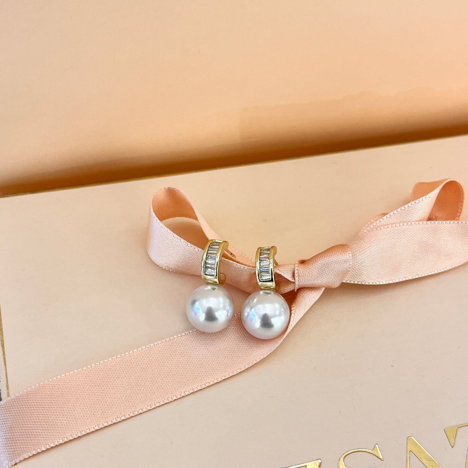 Crafted with baguette-shaped zircone and white round simulated pearls, these gold-plated earrings offer an elegant aesthetic. The combination of materials ensures durability and a refined appearance, suitable for various occasions. The gold plating provides a tarnish-resistant finish, maintaining the earrings' shine over time.
