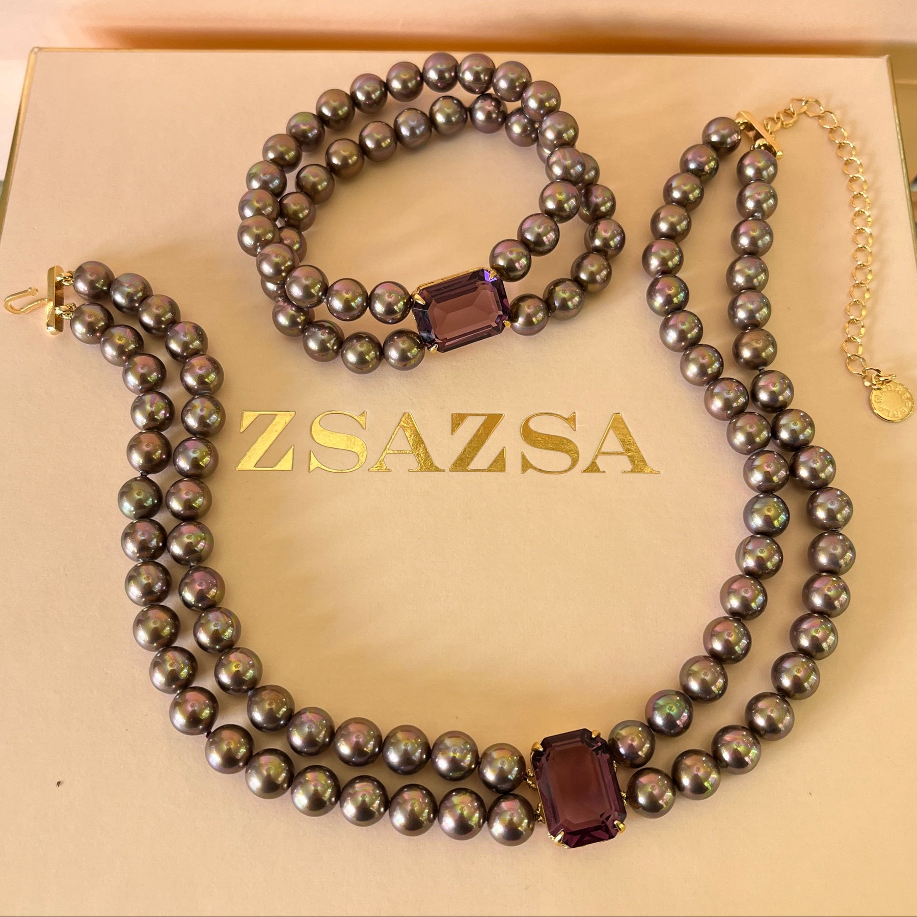Purple Mallorca pearls gold plated choker and bracelet