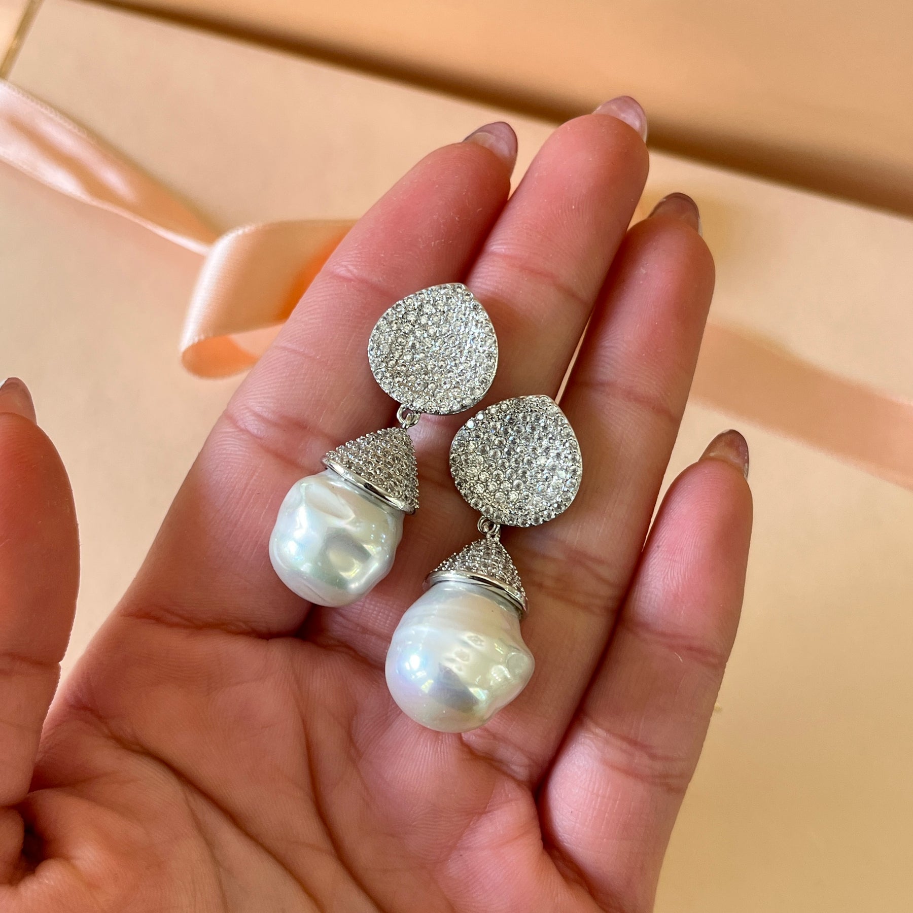 Elevate your collection with these sophisticated dangle earrings, featuring lustrous white baroque pearls paired with sparkling zirconia stones. Crafted with white gold plating, they offer a luxurious aesthetic with everyday wearability. The organic texture of baroque pearls combined with brilliant zirconia creates a dynamic interplay of light and dimension. Perfect for adding refined elegance to both casual and formal occasions.