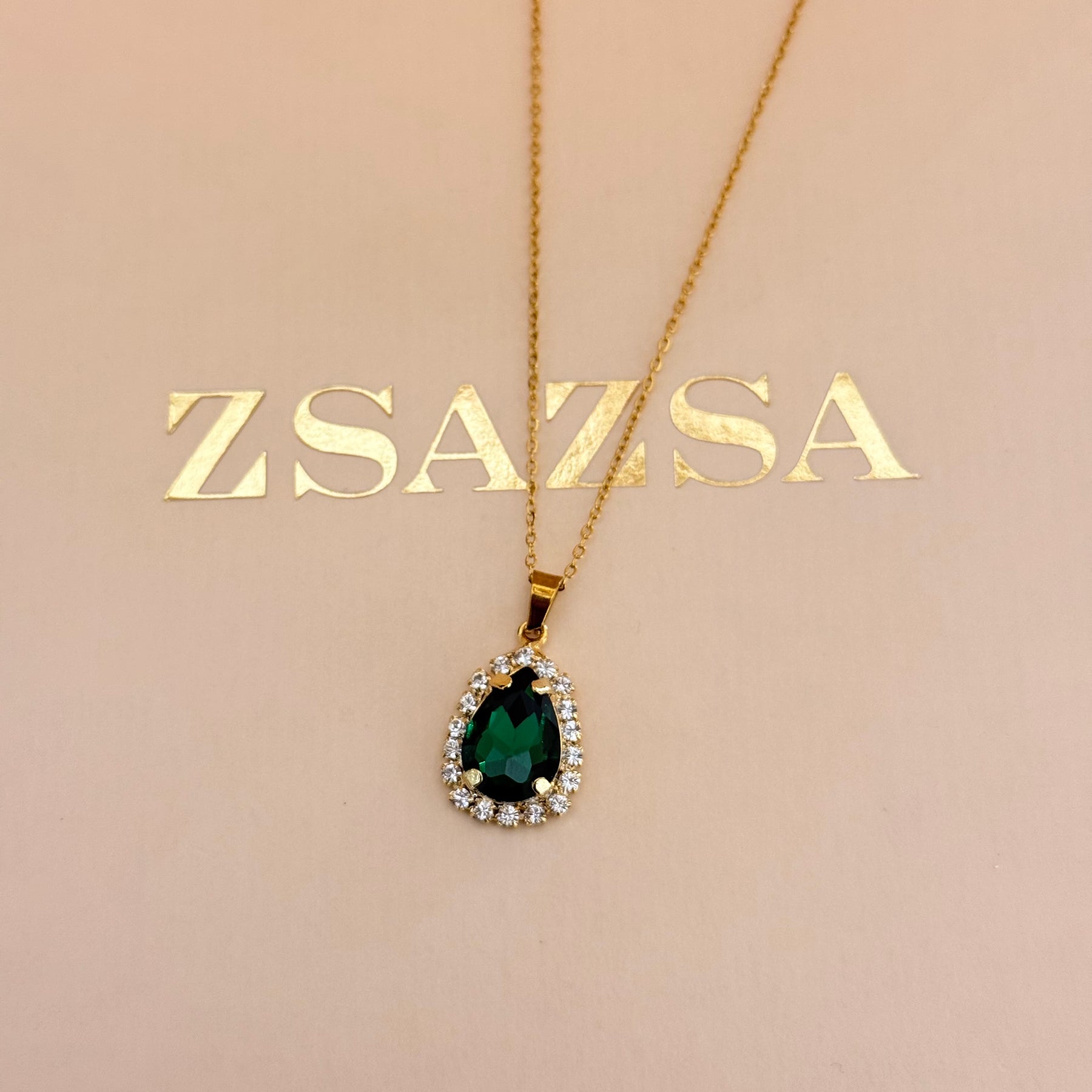 Elevate your style with our stunning dark green teardrop preciosa crystals pendant! The dazzling dark green crystal, in a classic teardrop shape, is delicately set in gold plated pendant. Make a bold statement and add a touch of elegance to any outfit.