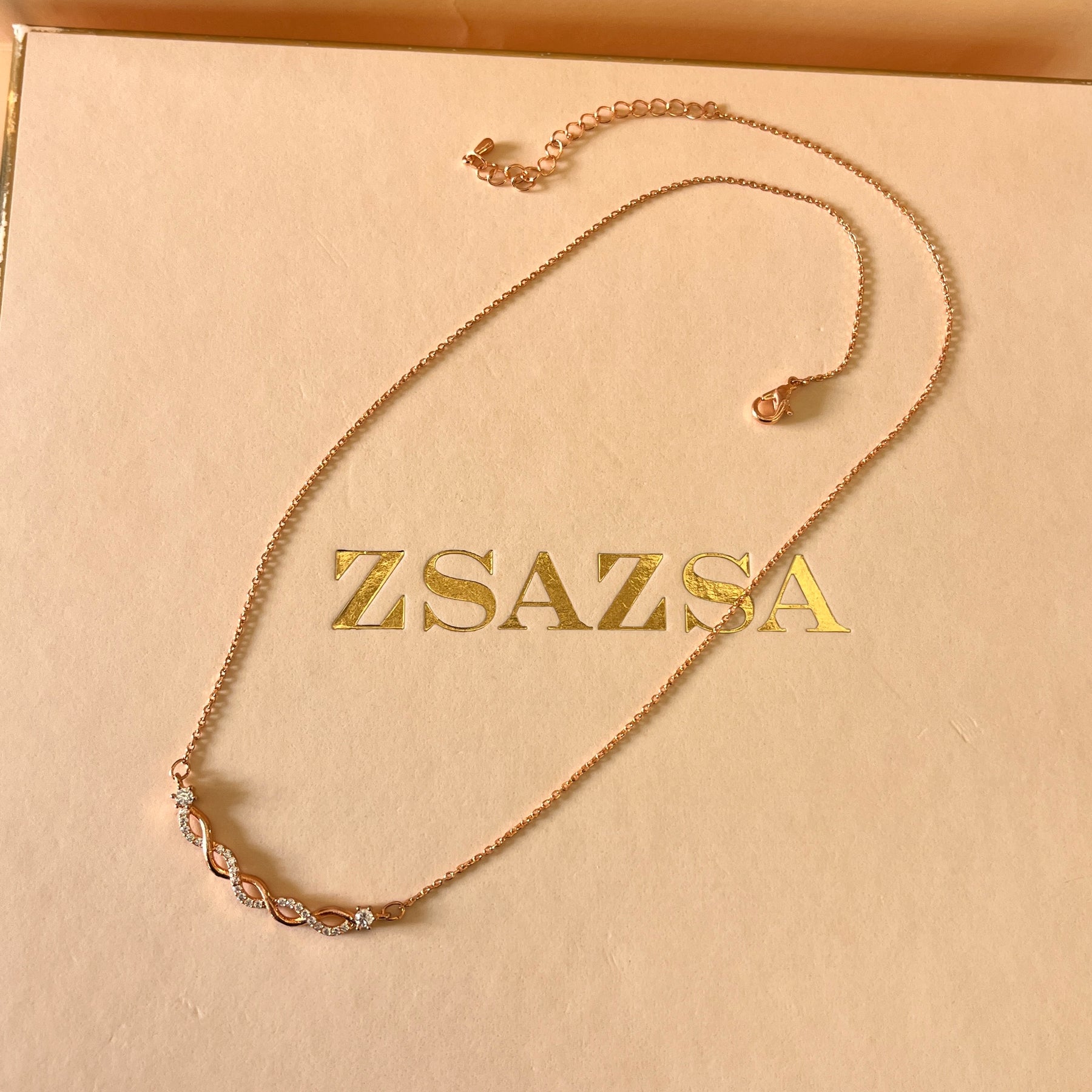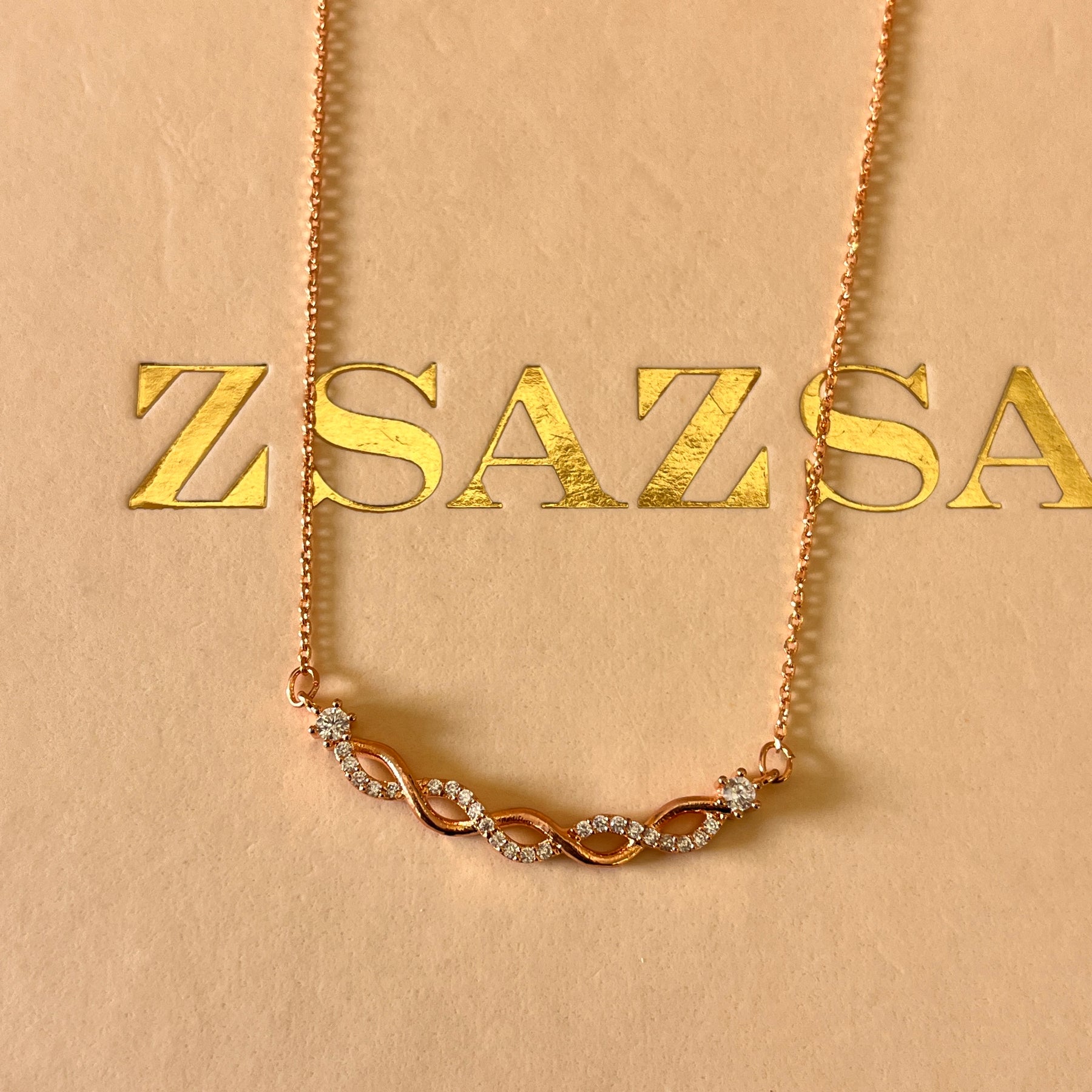 The Rose Gold Plated twisted pendant features elegantly shaped with dainty zircone stones in the pendant necklace, providing a refined aesthetic. The rose gold plating offering a femenine finish, suitable for various occasions. This set combines timeless design with a modern touch.