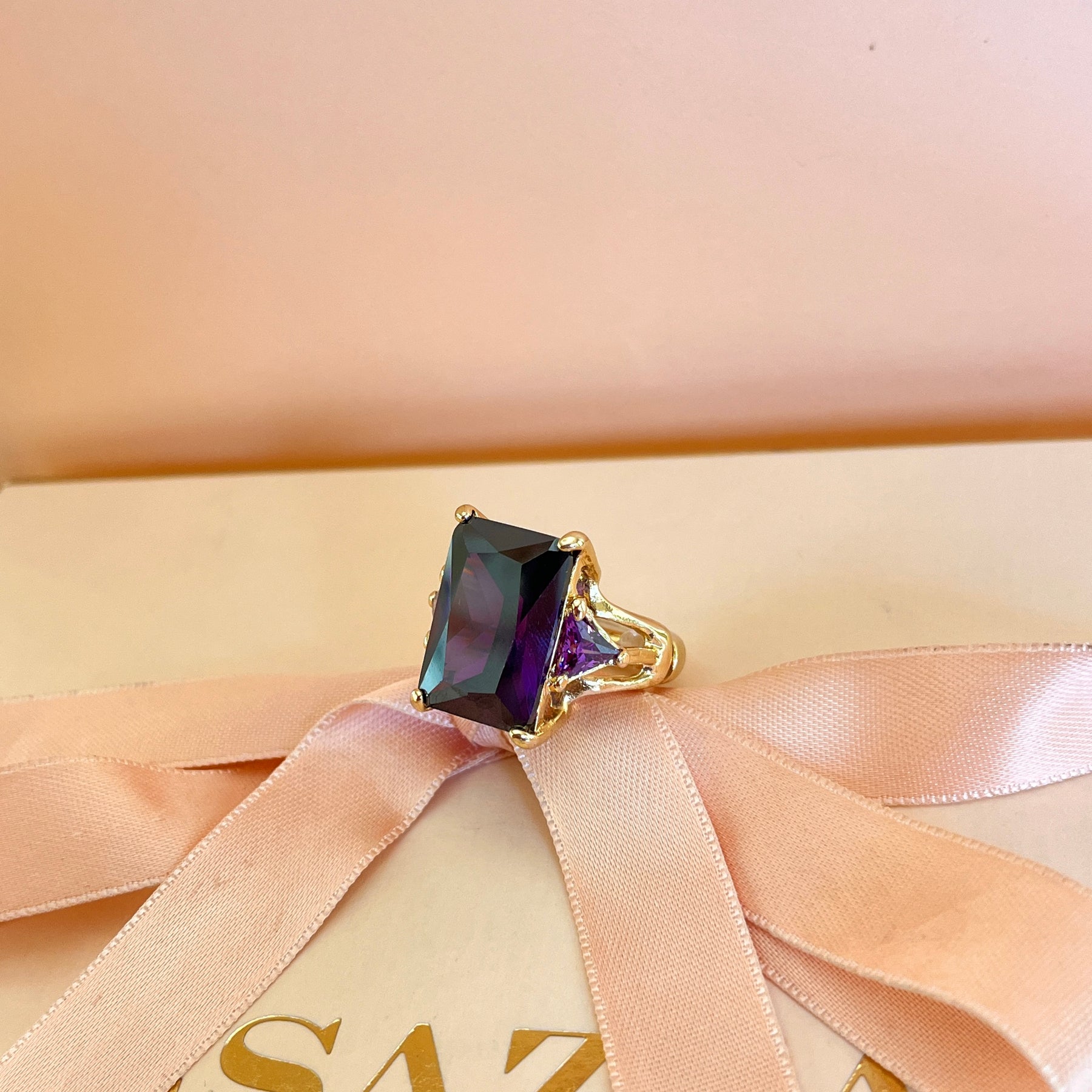 This purple rectangular ring is the perfect accessory for any occasion. With its purple rhinestone and rectangular shape, it adds a touch of elegance to any outfit. The adjustable and gold-plated design make it a versatile piece that can be worn on any finger. Elevate your style with this stunning ring!