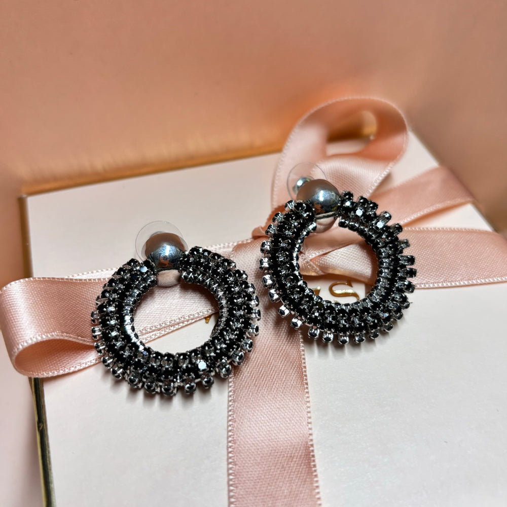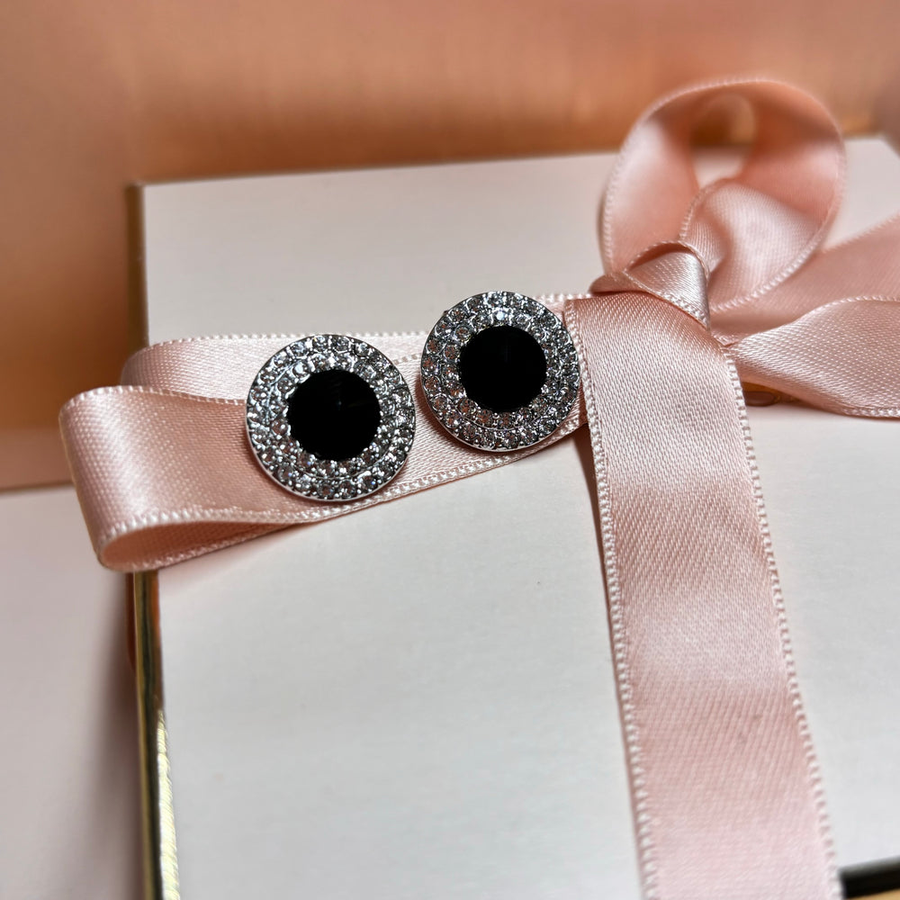 Round black rhinestone silver earrings