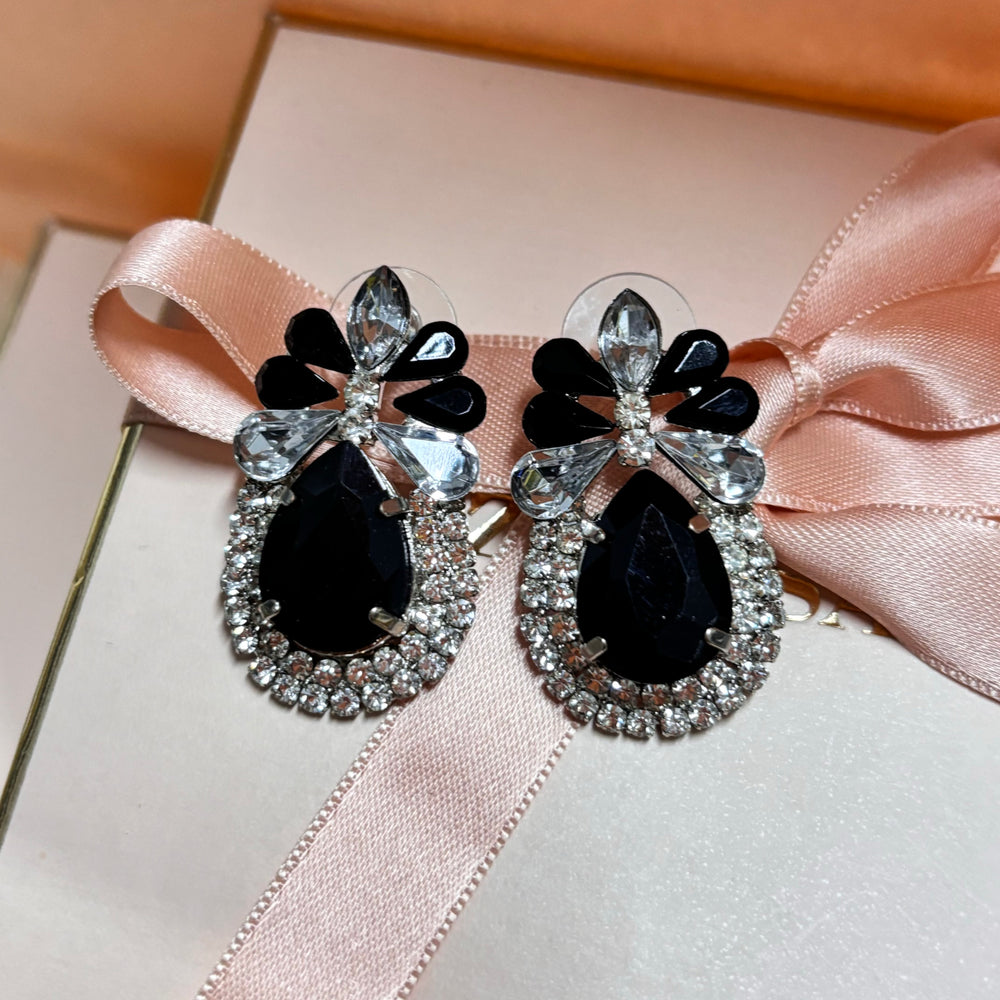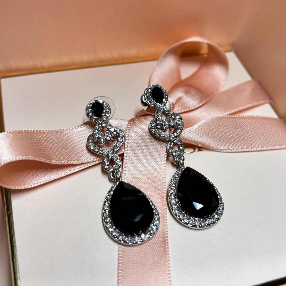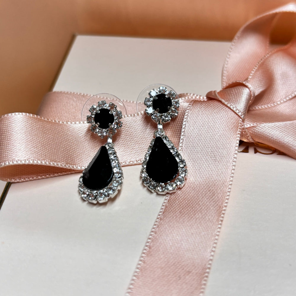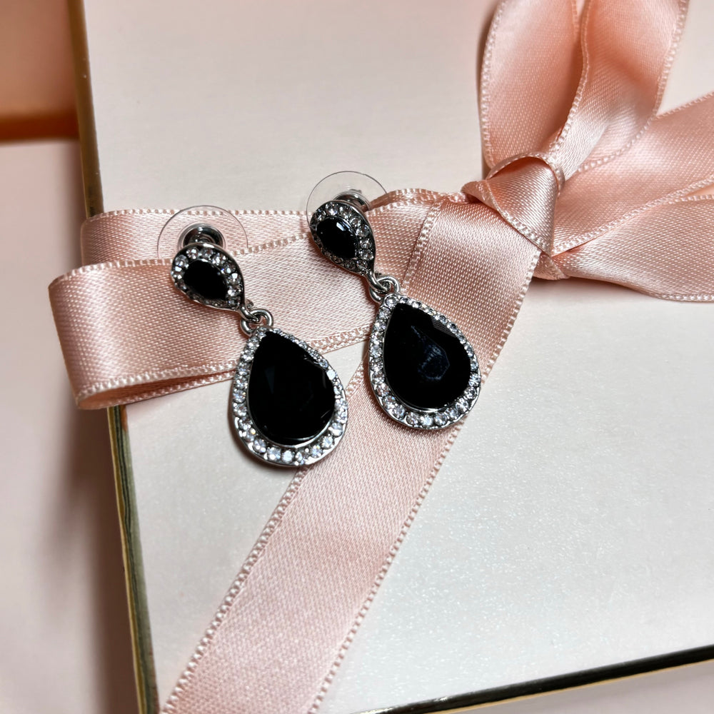 Teardrop Black rhinestone silver earrings
